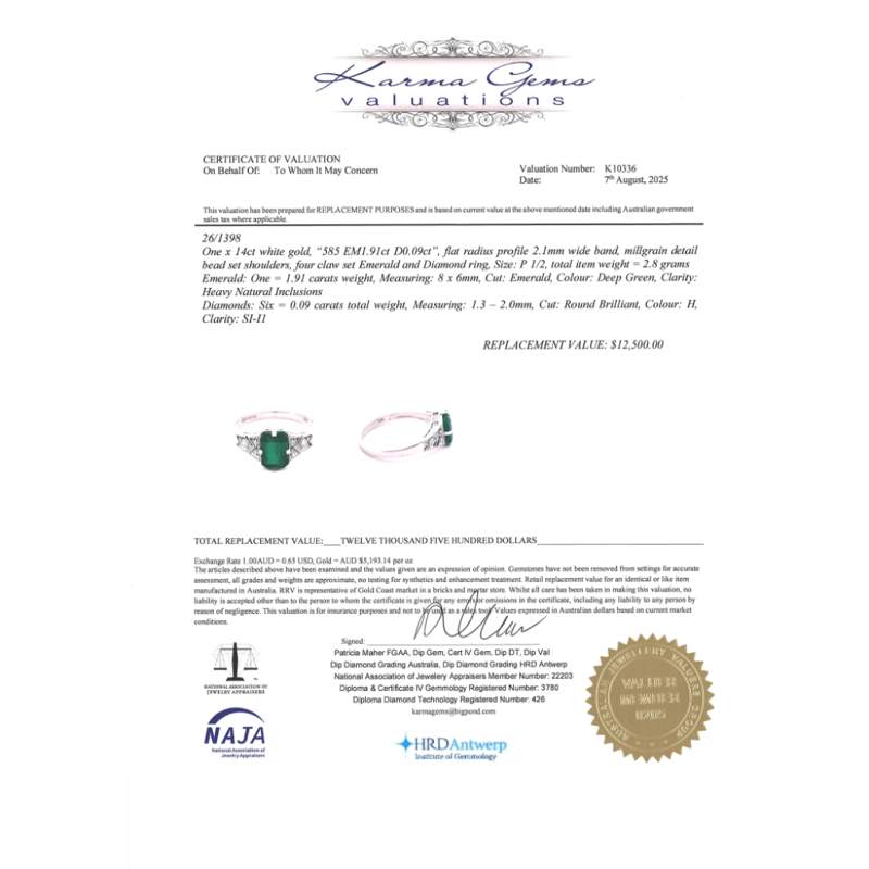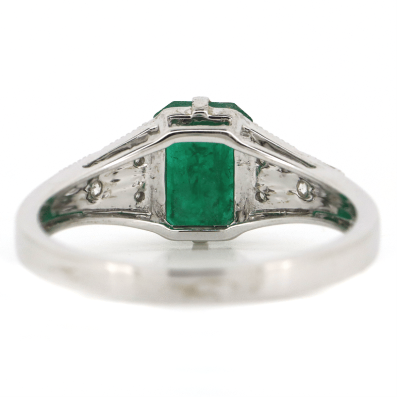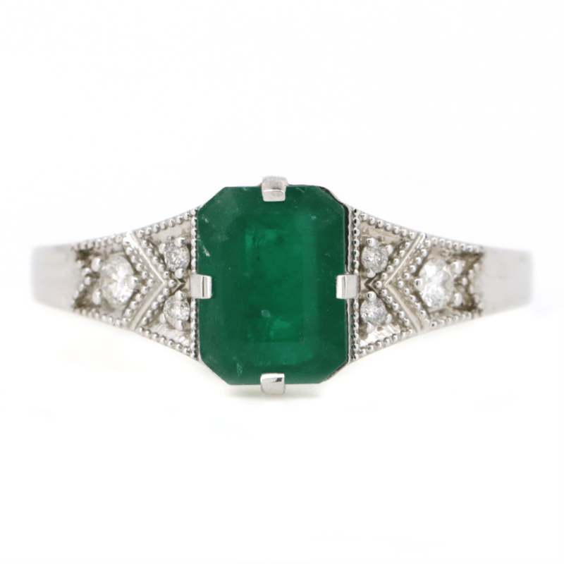 The Centre Features, One Emerald Cut, Emerald (1.91Ct, Heavy Natural Inclusions), 4 Claw Set. Decorating The Band Are, 6 Round Brilliant Cut, Diamonds (0.09Ct Tdw, H Colour, Si-I1 Clarity), Micro Pip Set With Milligrain Details. Ring Size P 1/2.