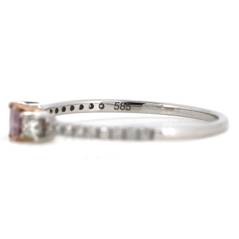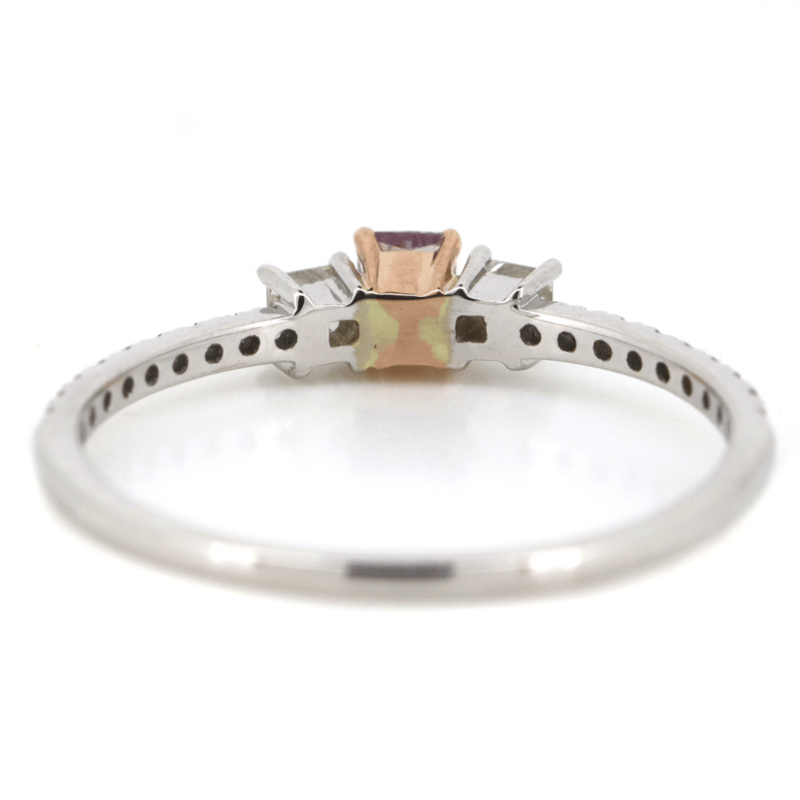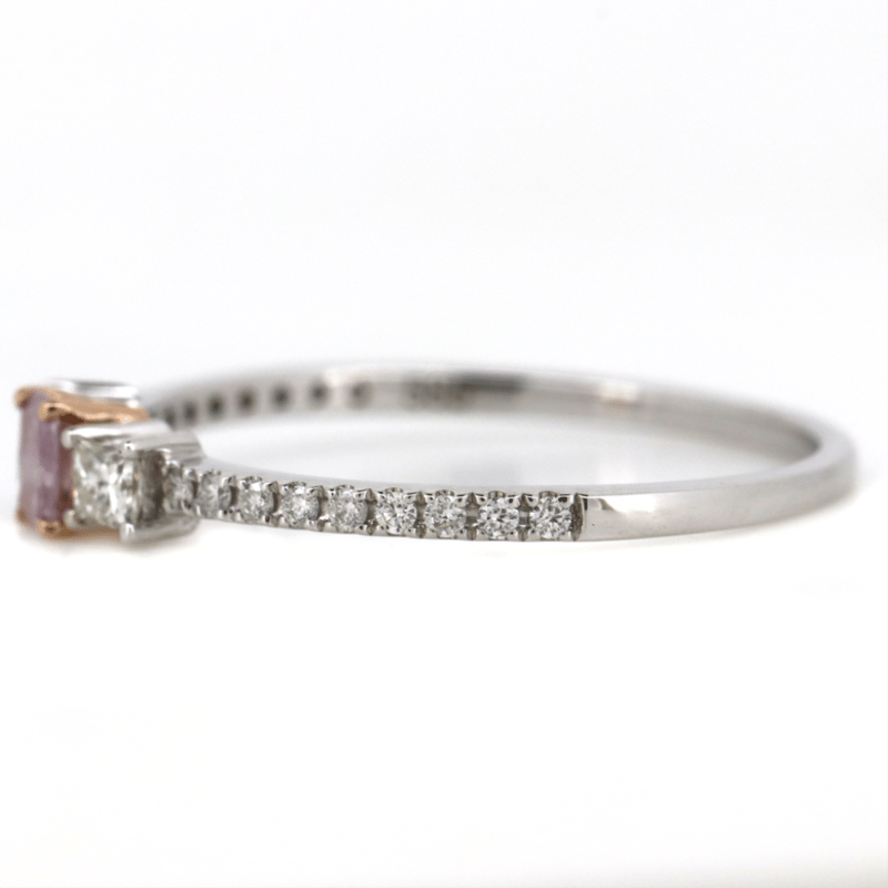 The Centre Features, One Emerald Radiant Cut, Pink Diamond (0.14Ct, I3 Clarity), Claw Set. Flanking The Centre Are, 2 Princess Cut, Diamonds (0.13Ct Tdw, H-J Colour, Vs1 Clarity), Claw Set. Decorating The Band Are, 18 Round Brilliant Cut, Diamonds (0.09Ct Tdw, G-H Colour, Si1-I2 Clarity), Claw Set. Ring Size M 1/2.