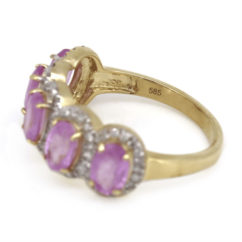 14K YELLOW GOLD, PINK SAPPHIRE AND DIAMOND, DECORATIVE BAND RING.