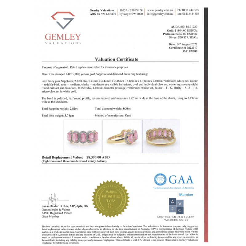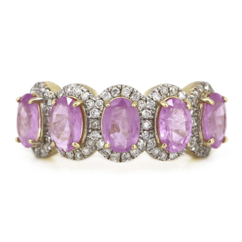 The Design Features, 5 Oval Cut, Medium Reddish-Pink, Sapphires (2.82Ct Tsw, Moderate Eye Visible Inclusions), Claw Set. Surrounding The Sapphires In Individual Halos Are, 78 Round Brilliant Cut, Diamonds (0.38Ct Tdw, J-K Colour, Si2-I2 Clarity), Micro-Claw Set In White Gold. Ring Size M.