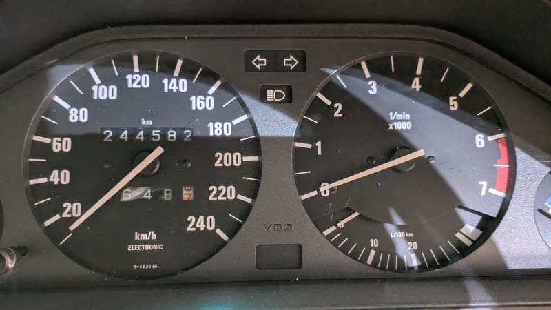 1988 BMW E30 318i four‑door sedan finished in Blue. Left‑hand drive configuration with rear‑wheel drive, powered by a 1.8‑litre inline‑four petrol engine paired with a 4‑speed automatic transmission. Odometer indicating 244,582 kilometres. Seating for five occupants.