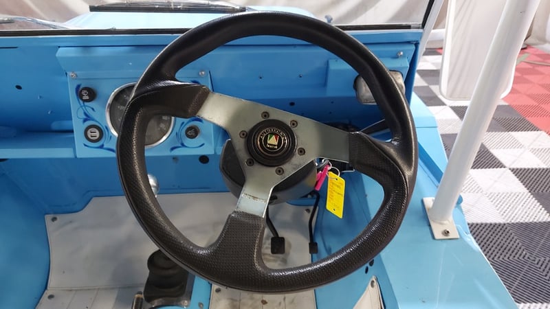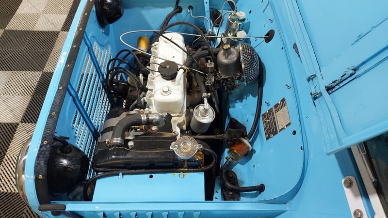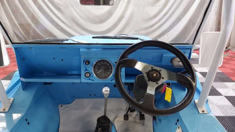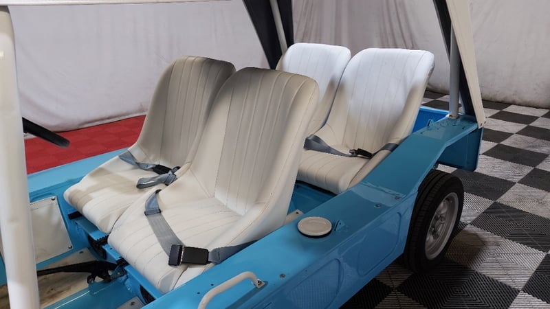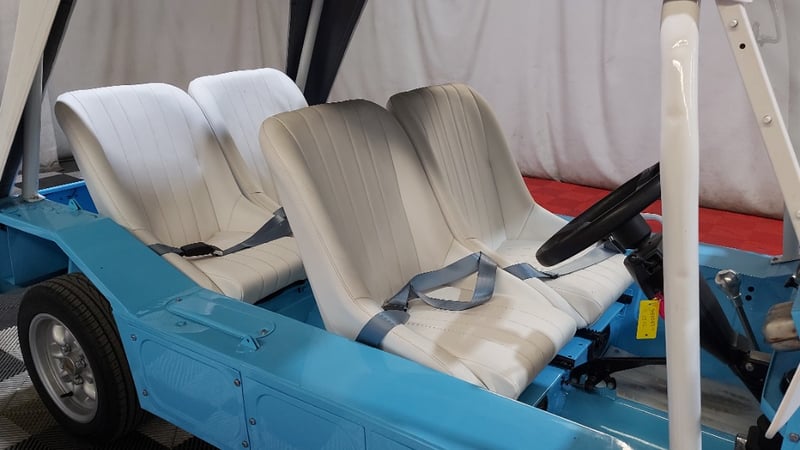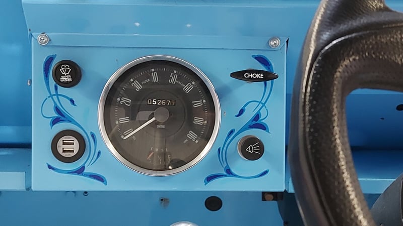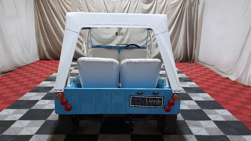 1966 Leyland Mini Moke two‑door convertible finished in Blue. Rear‑wheel drive configuration powered by a four‑cylinder petrol engine paired with a manual transmission. Odometer indicating 52,677 miles. Seating for four occupants.