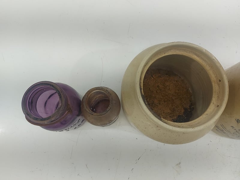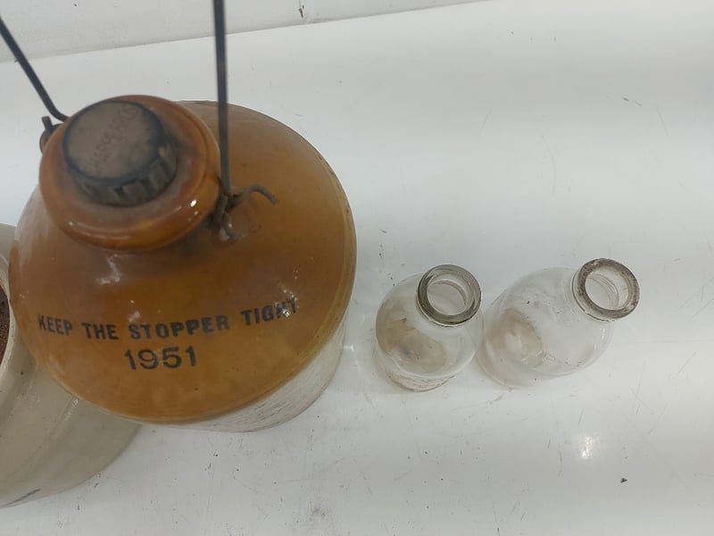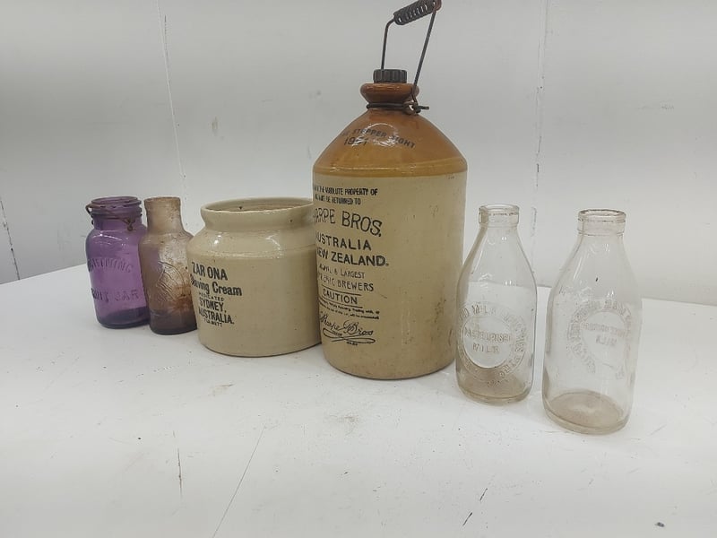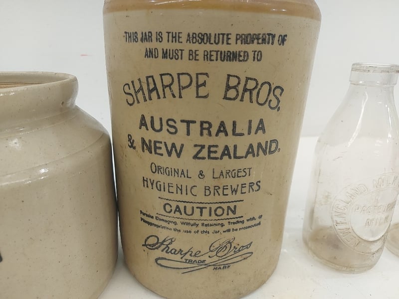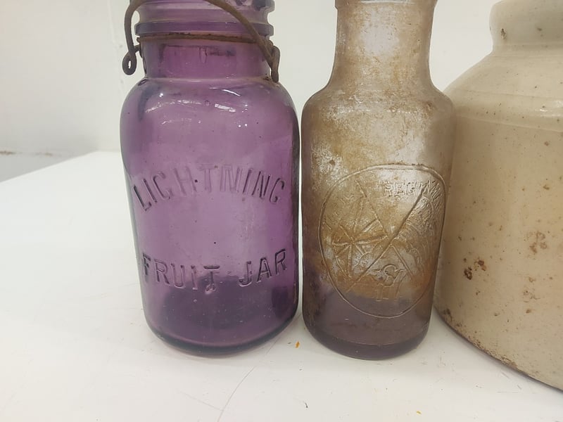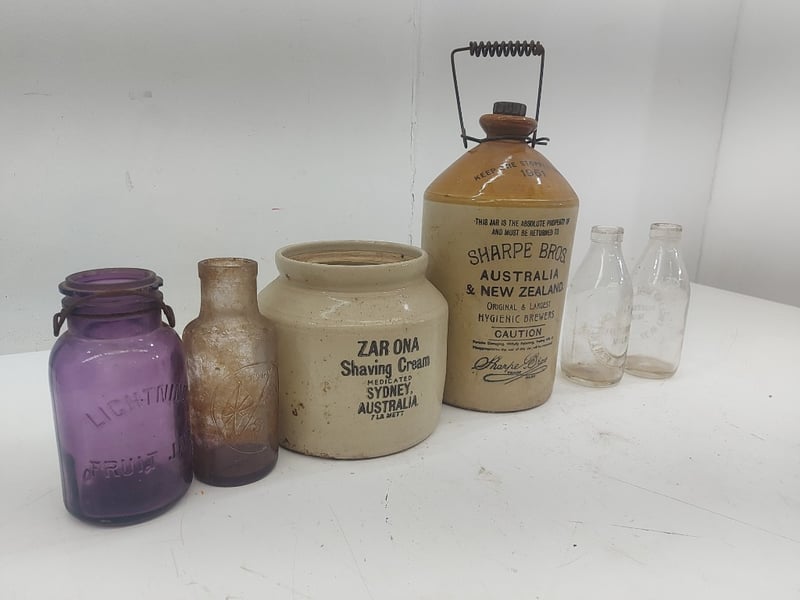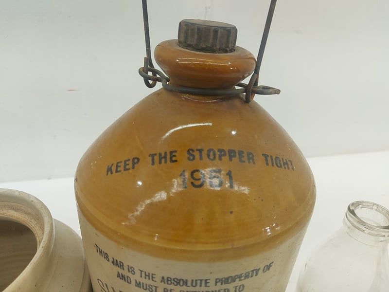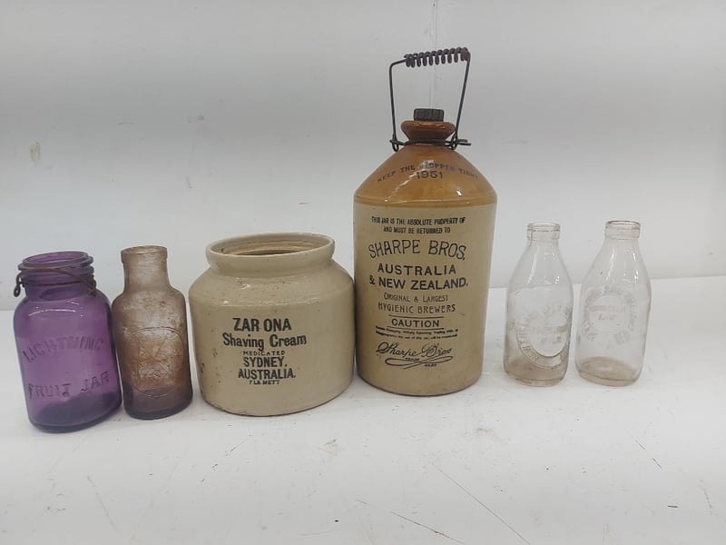 1951 SHARPE BROS STONEWARE DEMIJHON, ZAE OND MEDICATED SHAVING CREAM JAR, LIGHTING FRUIT JAR, NEW ENGLAND MILK INDUSTRIES PASTEURSED MILK JAR, QUANTITY 6