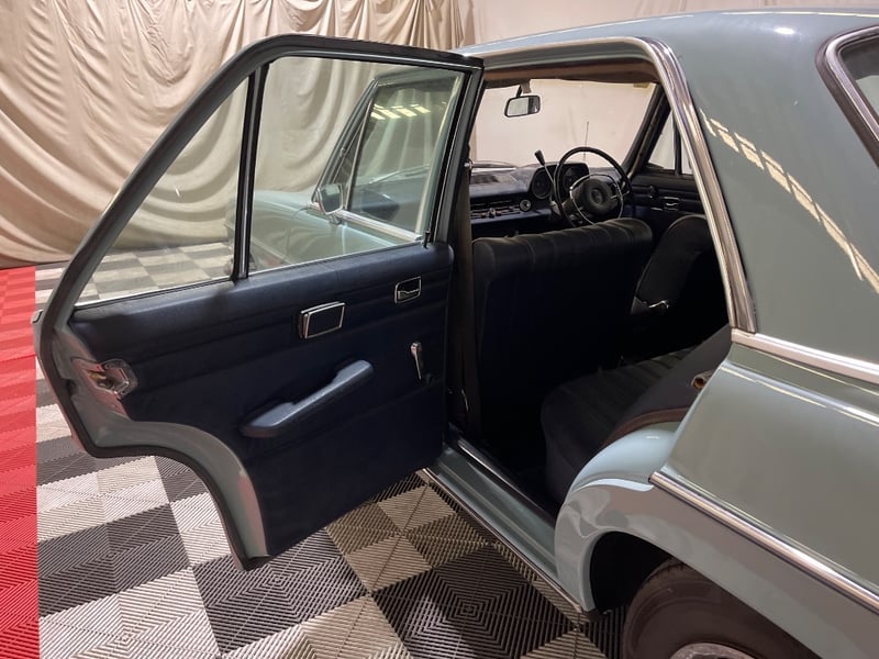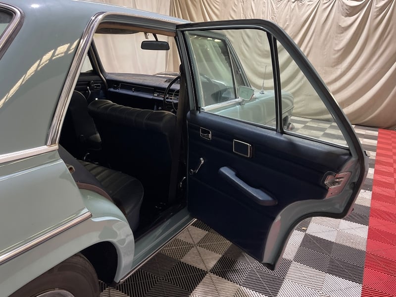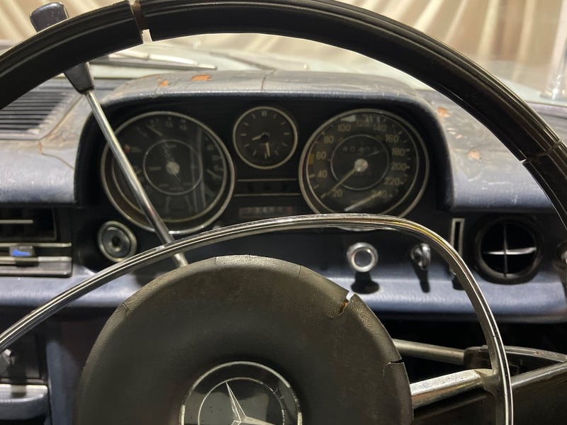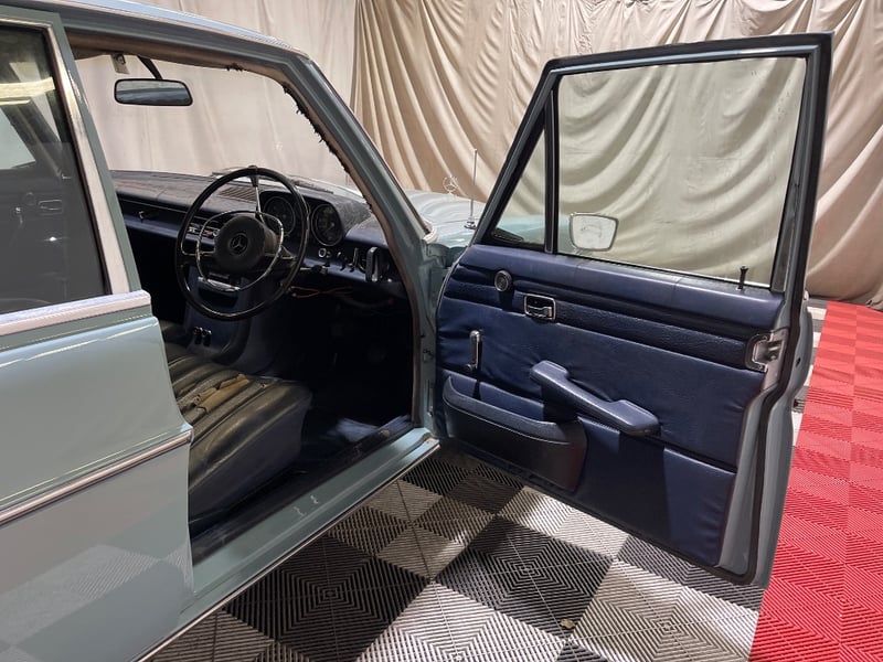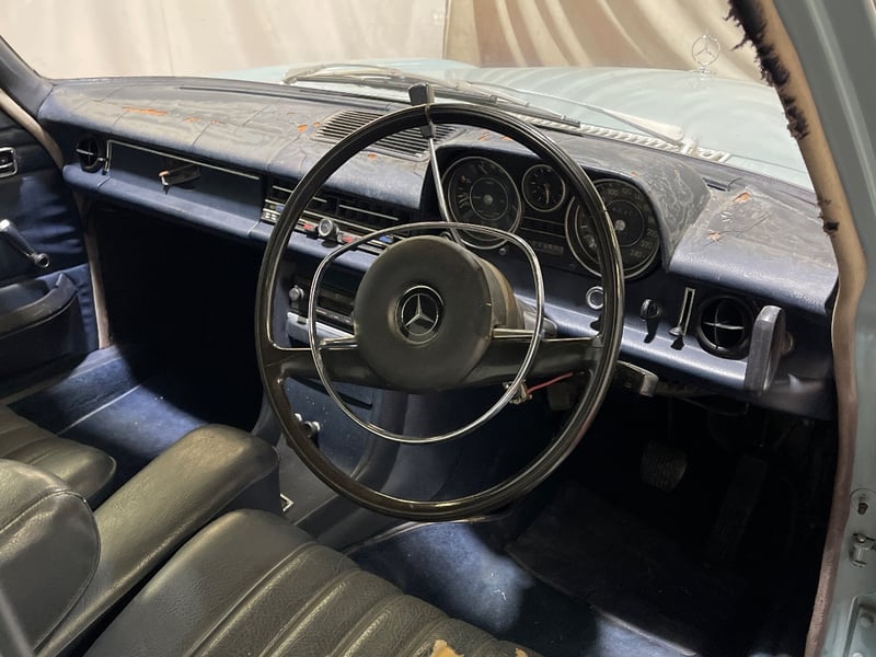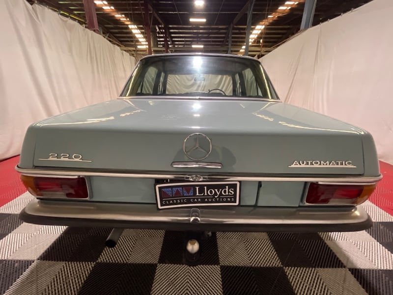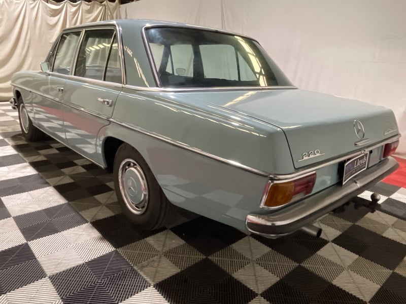 1969 Mercedes‑Benz 220 four‑door sedan finished in Blue. Rear‑wheel drive configuration powered by a 2.2‑litre inline‑four petrol engine paired with an automatic transmission. Odometer indicating 90,408 miles. Seating for five occupants.