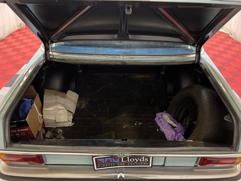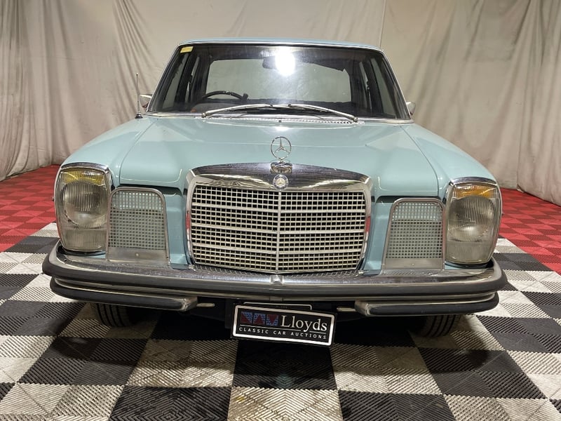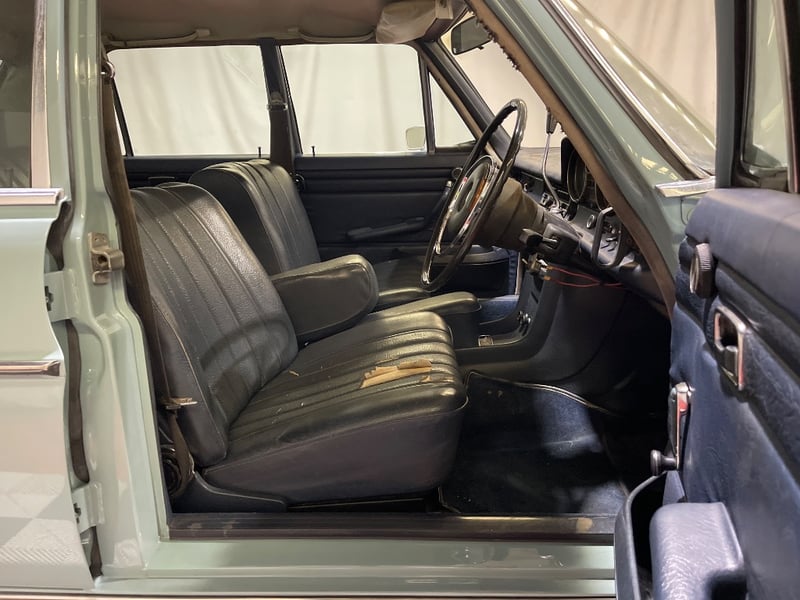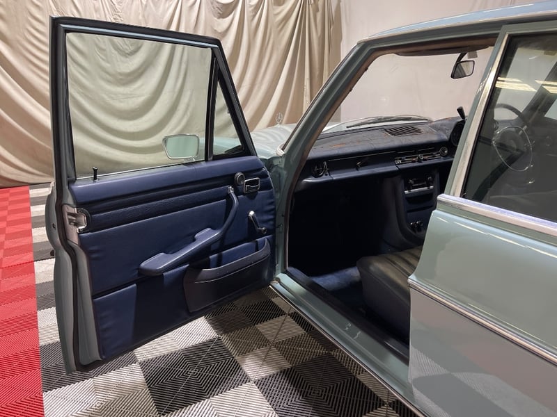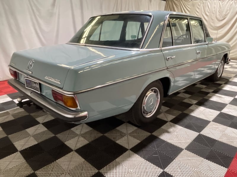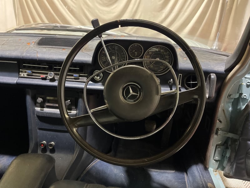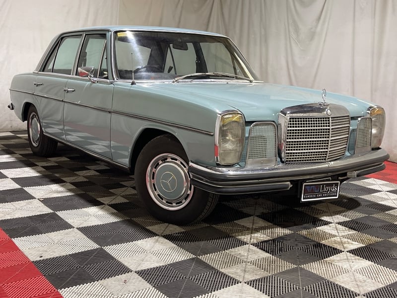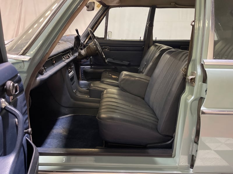 1969 Mercedes‑Benz 220 four‑door sedan finished in Blue. Rear‑wheel drive configuration powered by a 2.2‑litre inline‑four petrol engine paired with an automatic transmission. Odometer indicating 90,408 miles. Seating for five occupants.