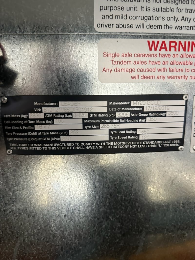 2019 Leader Gold LE Caravan MY20 – 22.6ft A spacious and well-equipped family touring caravan, this 2019 Leader Gold LE MY20 offers comfort, practicality and strong carrying capacity, making it an ideal choice for families or travellers seeking dependable accommodation on the road. With its generous 22.6ft length and tandem axle configuration, this caravan provides ample internal living space while maintaining stable towing performance. Designed to accommodate family adventures, the van features a practical layout including three bunk beds and sleeping capacity for up to six people. The interior is complemented by a full ensuite with separate shower and toilet facilities, supporting comfortable self-contained travel for extended holidays or weekend getaways. Externally, the caravan is fitted with a full-length awning, extended drawbar and additional storage solutions including an under-chassis toolbox. Practical touring accessories such as front and rear bike racks—capable of carrying up to four bikes—add versatility for active families and outdoor enthusiasts. The inclusion of external batteries and an additional outdoor shower further enhances its suitability for touring and camping use. The vendor advises the caravan has been stored undercover in a shed and that all systems are functioning as intended, presenting in excellent condition and ready for immediate use. Key Features • 2019 Leader Gold LE MY20 family touring caravan • Approx. 22.6ft length • Tandem axle configuration for improved towing stability • Sleeps up to six people • Three bunk beds • Full ensuite with separate shower and toilet • Rear-mounted reverse camera • External battery setup • Hi-fi system with external speakers • Full-length roll-out awning • Extended drawbar fitted • Under-chassis storage box • Additional external shower • Front and rear bike racks (carries up to four bikes) • Stored undercover in shed • Vendor advises everything is functioning as per specifications Length: 22.6ft Colour: Grey / Black Tare: 2836kg GTM: 3296kg ATM: 3486kg VIN: 6T9T21V86LAF01012 A well-presented and family-ready caravan offering generous space, practical features and reliable touring capability, representing excellent value for buyers seeking a comfortable and versatile travel companion. Location: Heathcote, VIC