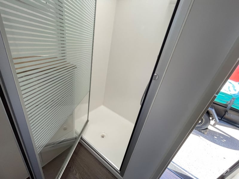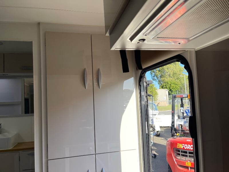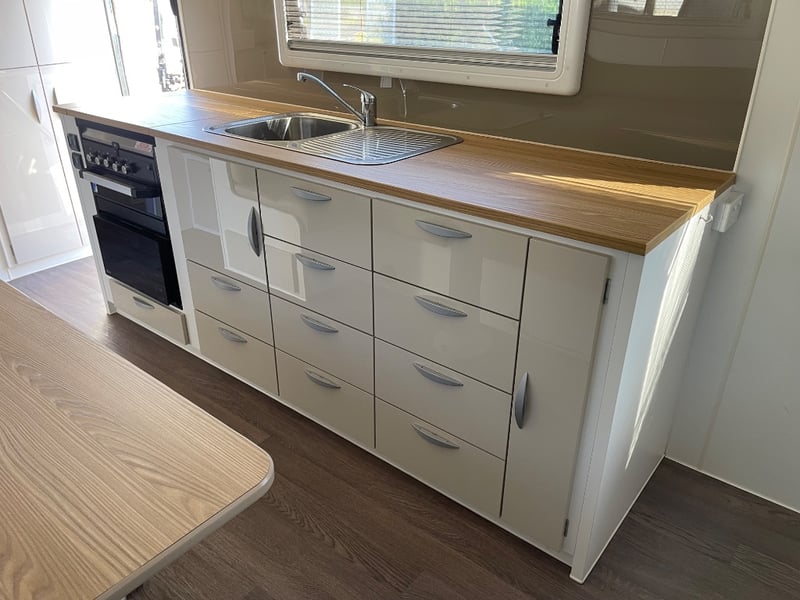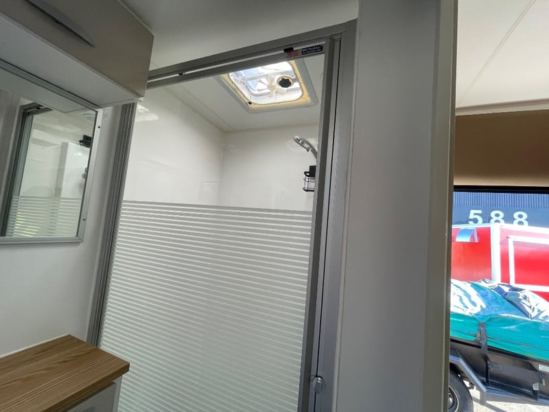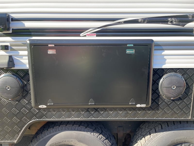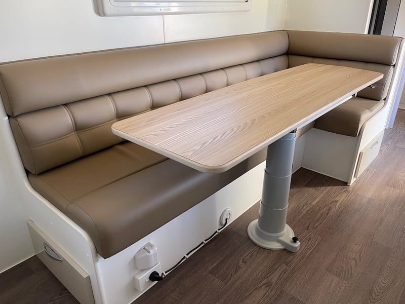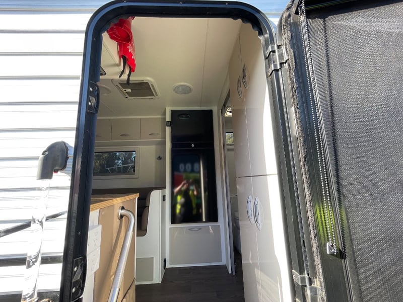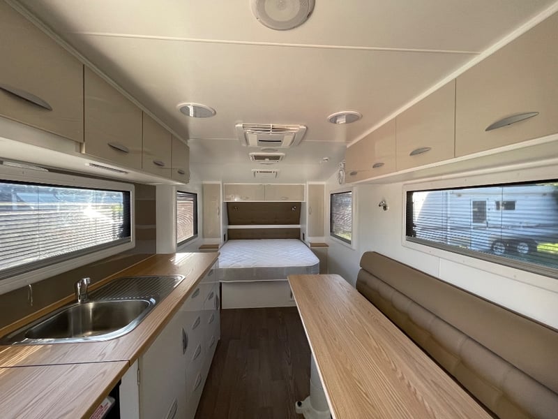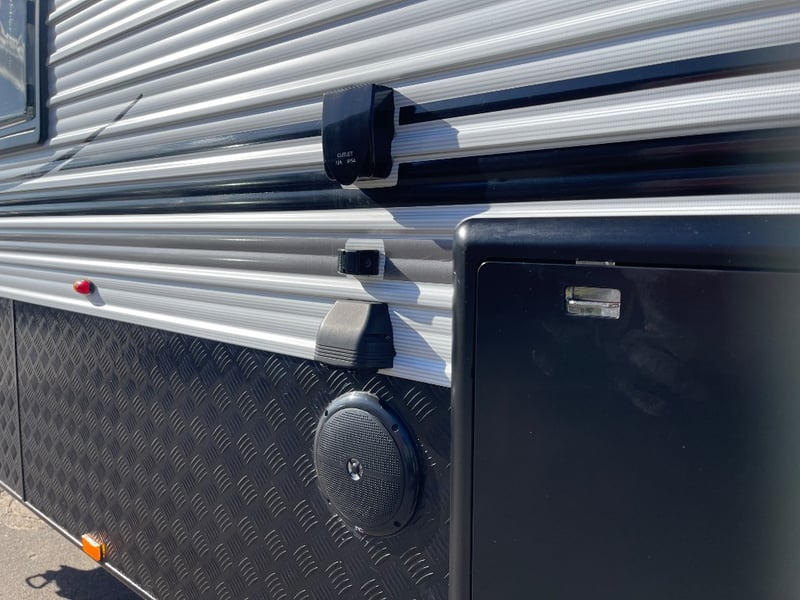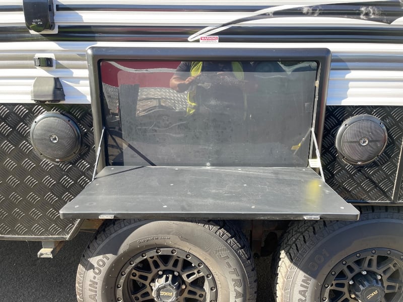 Inside, the caravan offers a comfortable and practical living environment with a full ensuite bathroom, washing machine and well-appointed kitchen featuring quality appliances. Climate control is provided by a Dometic IBIS 4 air conditioning system, and entertainment is supported by an integrated Fusion audio system with internal and external speakers. An additional slide-out external kitchen further enhances outdoor cooking and entertaining capability.