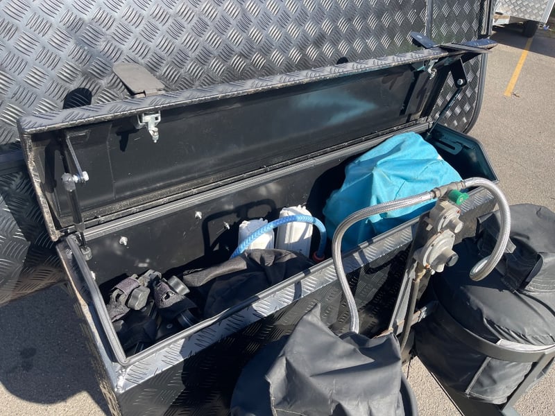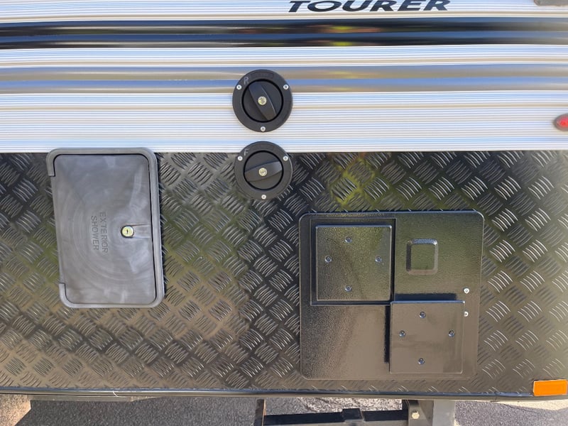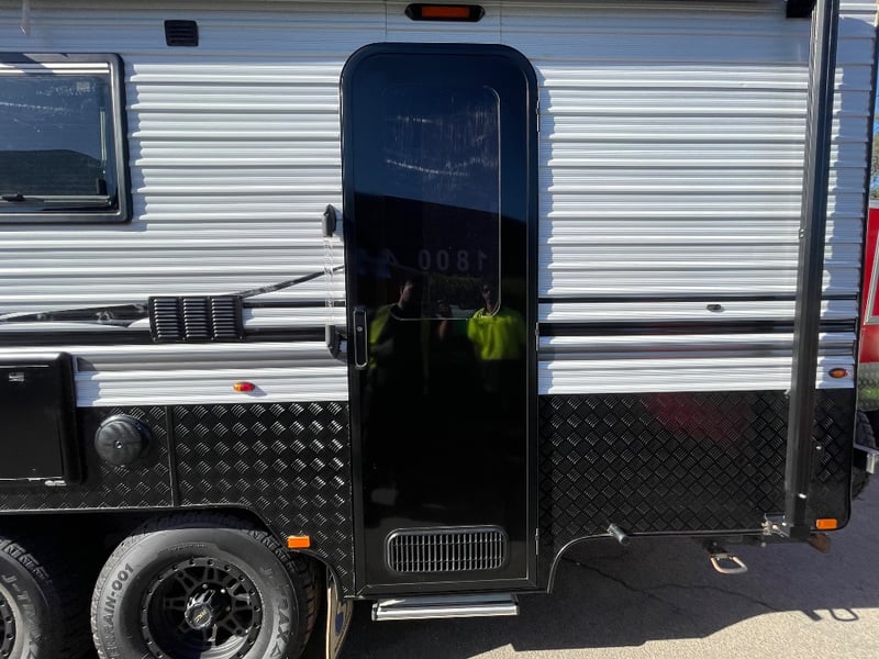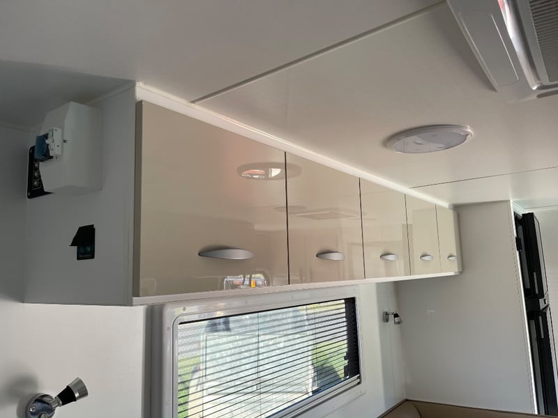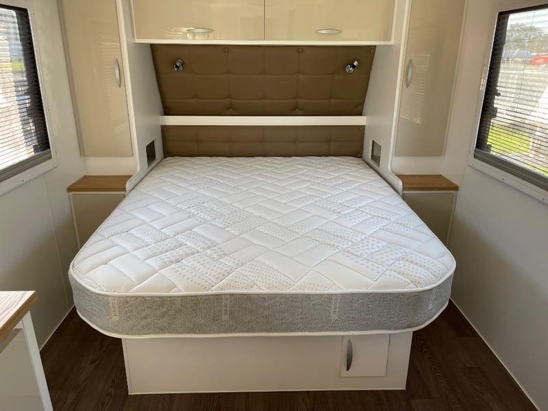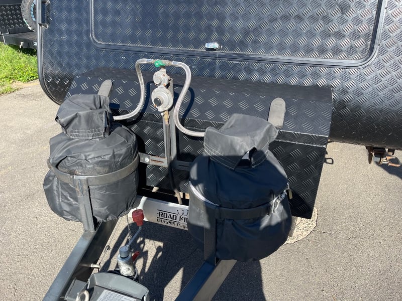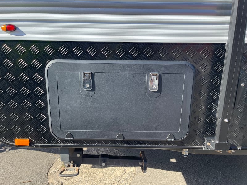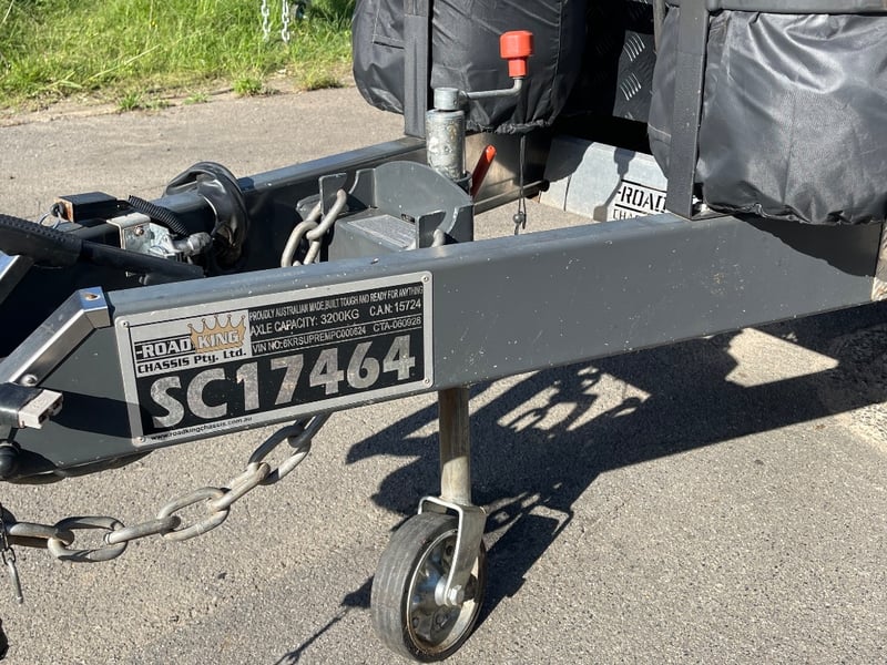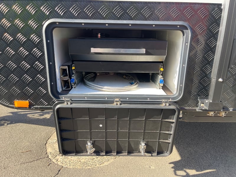 The caravan is fitted with a comprehensive electrical and off-grid setup, including a 200Ah lithium battery system, 630 watts of solar panels, Redarc Manager 30 battery management system and a 2500W Enerdrive inverter. Water capacity is supported by dual fresh water tanks and a grey water tank, while safety features such as BMPRO sway control and electric breakaway control enhance towing confidence.