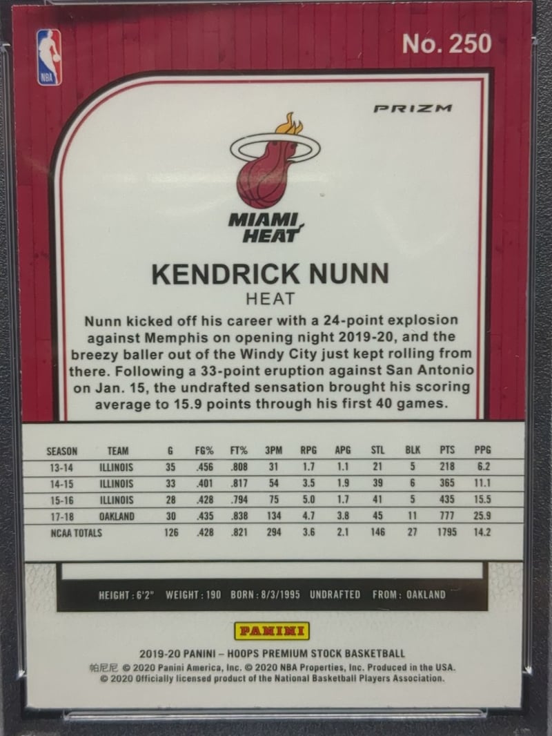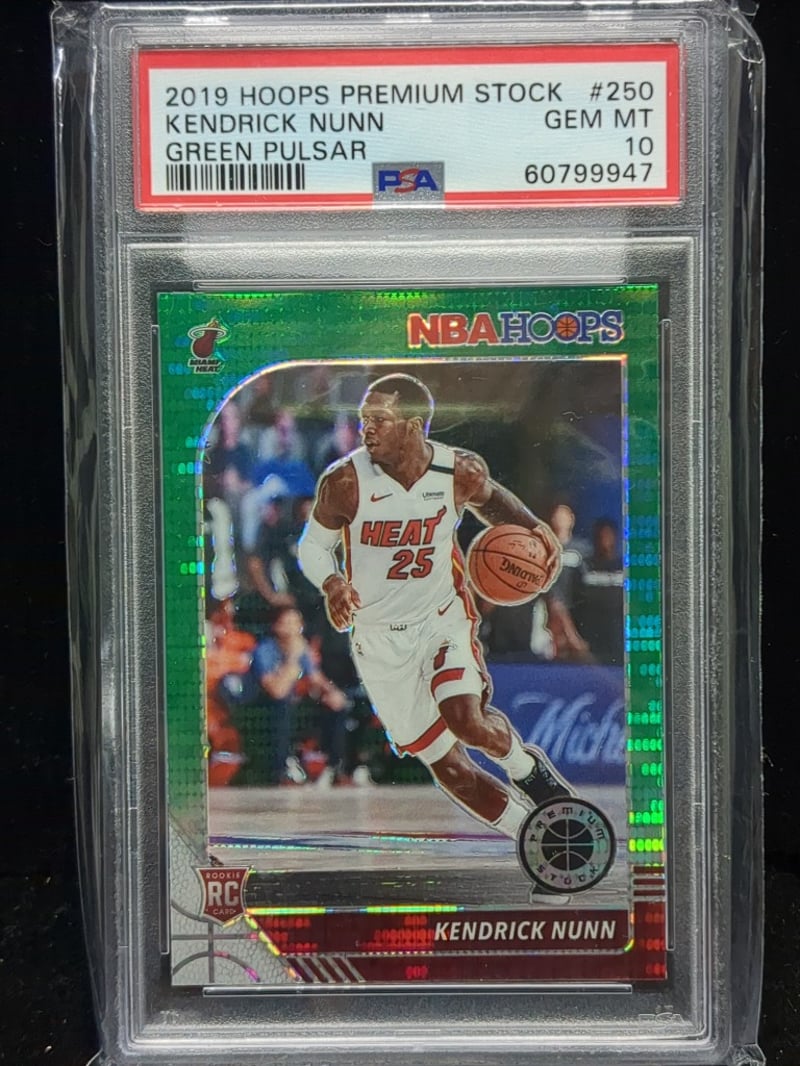 PANINI HOOPS PREMIUM STOCK #250 KENDRICK NUNN GREEN PULSAR ROOKIE CARD - PSA GEM MINT 10 Highly Graded Rookie Card Featuring Kendrick Nunn In Miami Heat Uniform, Card #250 From Hoops Premium Stock Series With Sought-After Green Pulsar Parallel Variant. Psa Certified Gem Mint 10 Grade. Card Displays Pristine Condition With Sharp Corners, Excellent Centering, And Vibrant Green Pulsar Finish. Includes Player Statistics From His Undrafted Path Through Illinois And Oakland. Perfect For Heat Collectors And Nunn Enthusiasts. Condition: Good - Refer To Images 582933+2