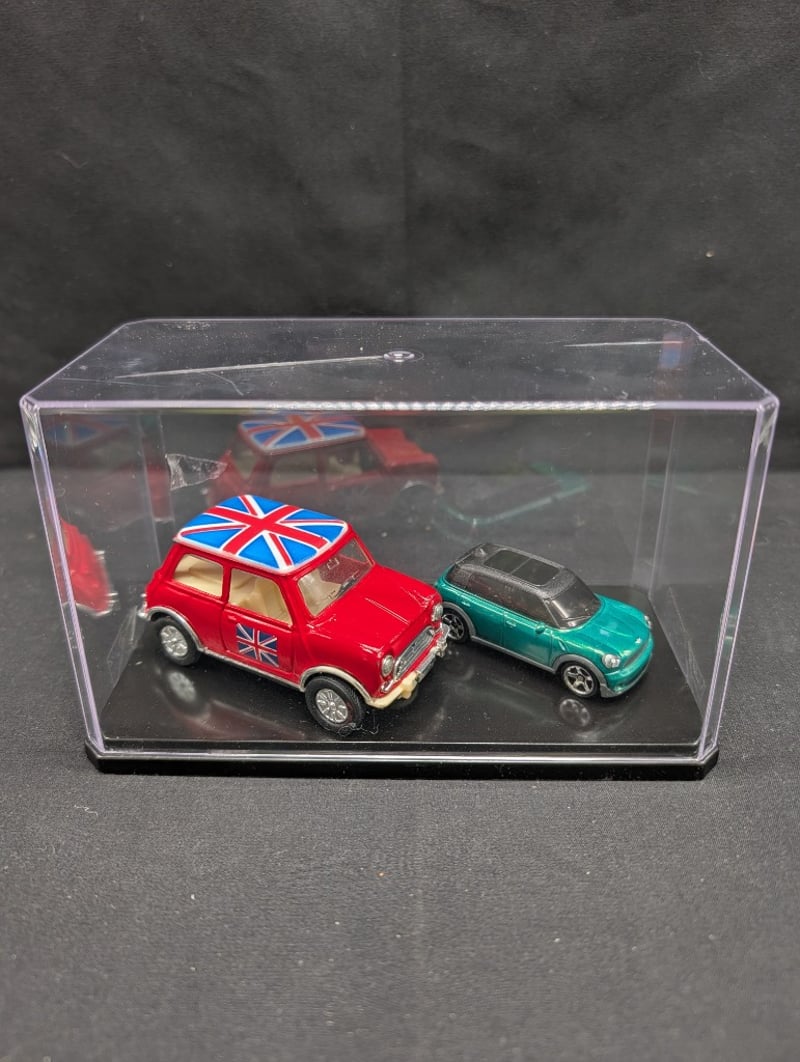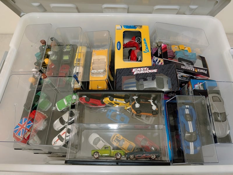 Collection of diecast model vehicles housed in clear acrylic storage container. Includes 40 individual models spanning multiple scales and manufacturers.