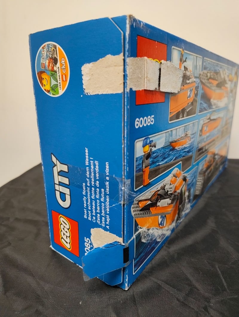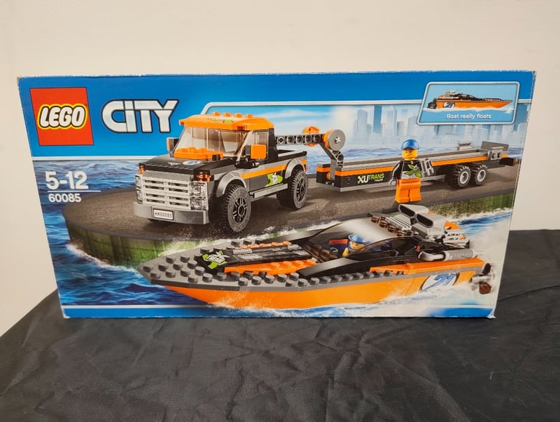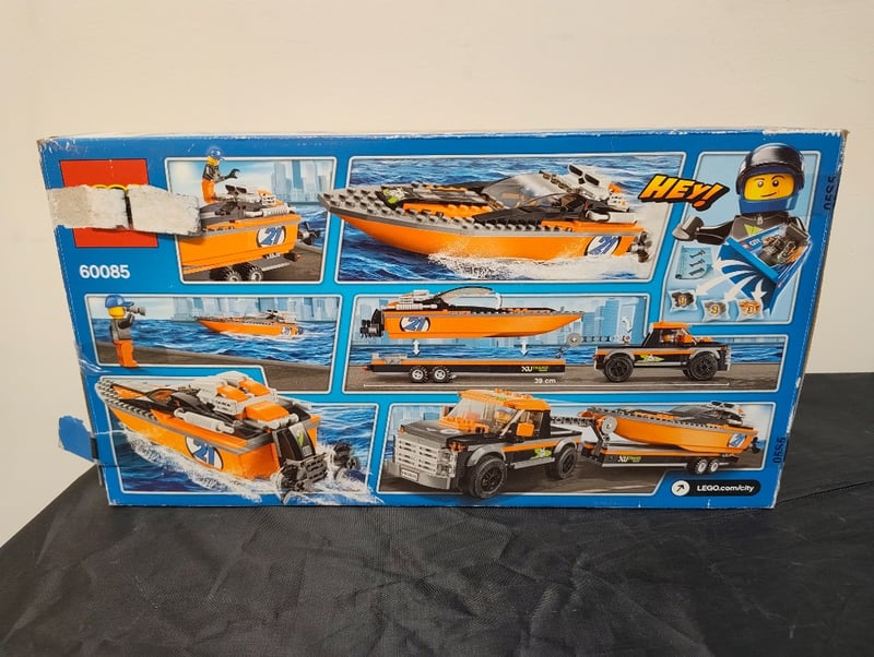 Lego City 60085 Construction Set Featuring An Orange And Black 4X4 Pickup Truck With Tow Hook, Enclosed Speedboat With Motorized Motor Function, Flatbed Trailer, Fuel Dispenser Accessory, And Two Minifigures With Helmet And Hard Hat. Complete Set With Original Blue Packaging Showing Water/Marine Rescue Theme, Designed For Ages 5-12 Years. The Set Demonstrates The Boat Floats Functionality As Advertised.