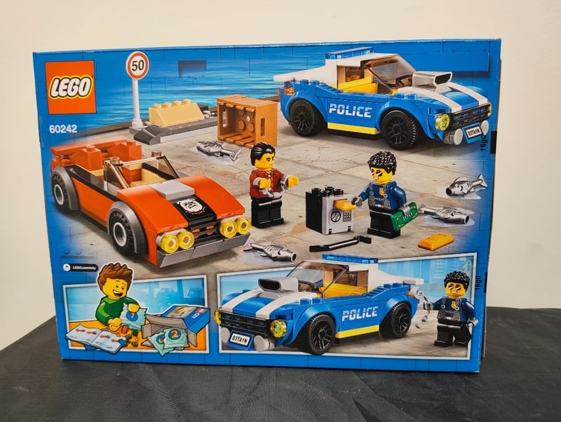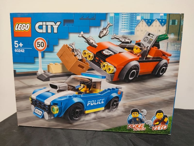 LEGO CITY POLICE CHASE SET 60242 Item Size: Height: 20cm, Width: 15cm, Depth: 10cm, Weight: 4Kg Lego City Set 60242 Featuring A Police Pursuit Scenario With A Blue Police Car, Orange Hot Rod Vehicle, And Accessories Including Two Minifigures (Duke And Vito), Fish Elements, Speed Limit Sign, And Various Building Components. The Set Comprises Approximately 50 Pieces And Is Suitable For Ages 5 And Up. Condition: Good - Refer To Images 655508+183