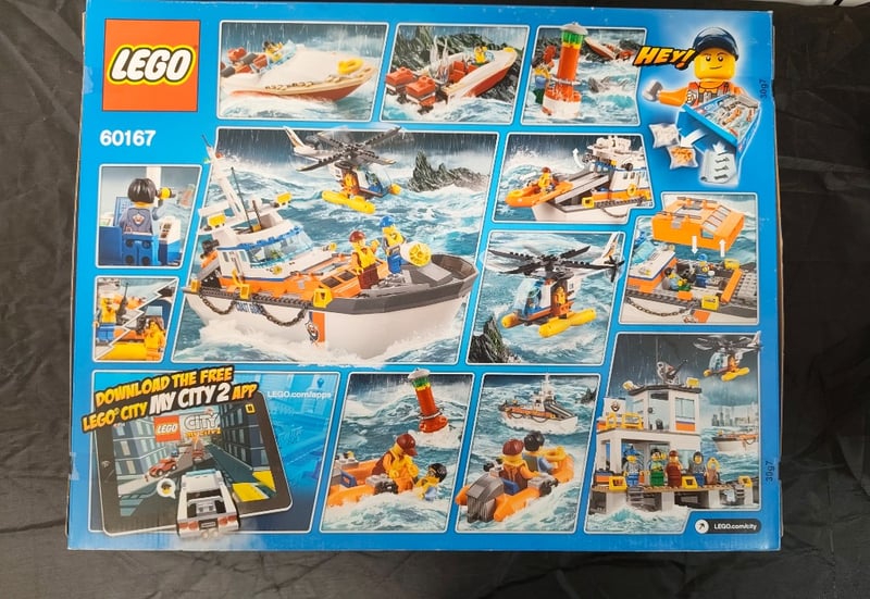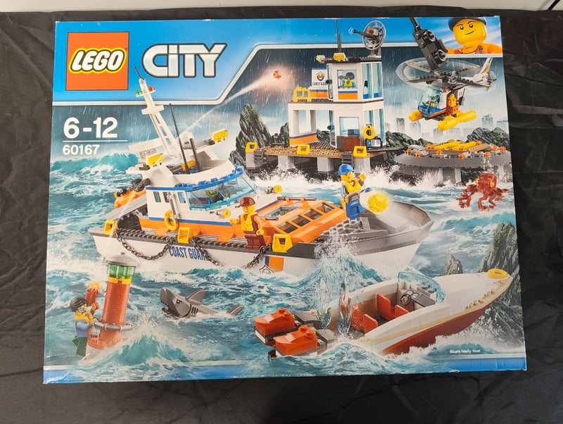 LEGO CITY COAST GUARD SET 60167 - SEALED RETAIL BOX Item Size: Height: 35cm, Width: 38cm, Depth: 12cm, Weight: 4Kg Lego City Coast Guard Headquarters Set 60167, Unopened Original Retail Packaging. Comprehensive Maritime Rescue Theme Featuring Coast Guard Station, Patrol Boat With Working Motor, Helicopter, Rescue Vehicles, And Multiple Minifigures. Age-Rated 6-12 Years. Includes Instruction Manual And Promotional Lego City App Download Offer Visible On Box Rear. Condition: Good - Refer To Images 655508+184