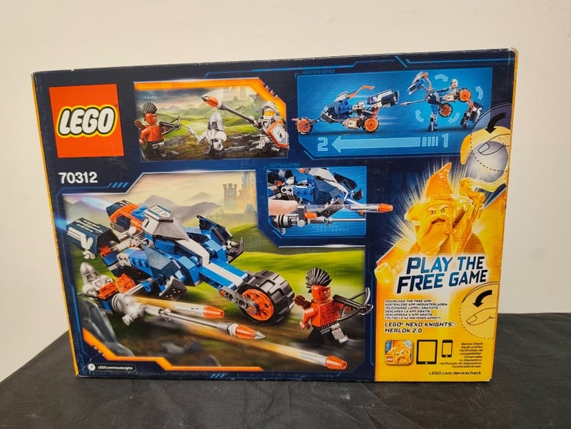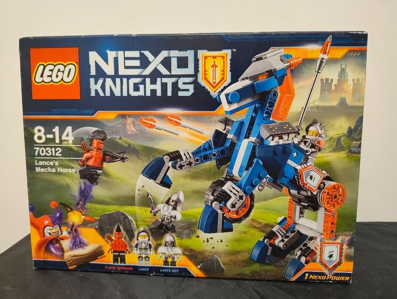 LEGO NEXO KNIGHTS 70312 LANCE'S MECHA HORSE SET Item Size: Height: 38cm, Width: 26cm, Depth: 10cm, Weight: 3Kg Lego Nexo Knights Set 70312 Featuring Lance'S Mecha Horse, A Blue And Orange Mechanized Steed With Articulated Limbs, Motorized Functionality Via Nexo Power, Includes Minifigures Of Lance, Flame Thrower, And Lance Bot, Complete With Projectile Accessories And Original Packaging Showing Castle Backdrop Scenery. Condition: Good - Refer To Images 655508+192
