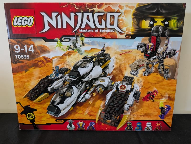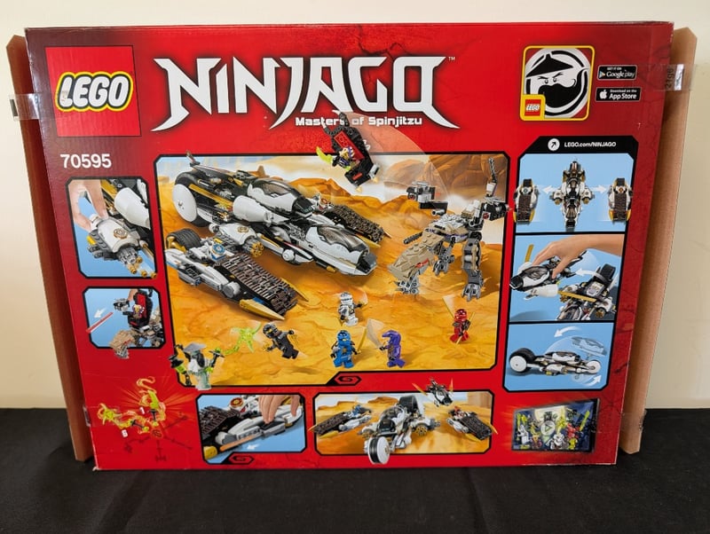 LEGO NINJAGO MASTERS OF SPINJITZU SET 70595 DESERT BATTLE COLLECTIONItem Size: Height: 60cm, Width: 35cm, Depth: 35cm, Weight: 4KgLego Ninjago Masters Of Spinjitzu Set 70595 Featuring Multiple Buildable Vehicles And Minifigures Including Desert-Themed Mechs, Speeders, And Aircraft With Golden Accents. Complete With Original Packaging And Instruction Details Visible. Designed For Ages 9-14.Condition: Good - Refer To Images584531+1