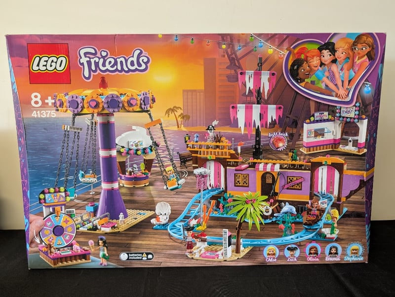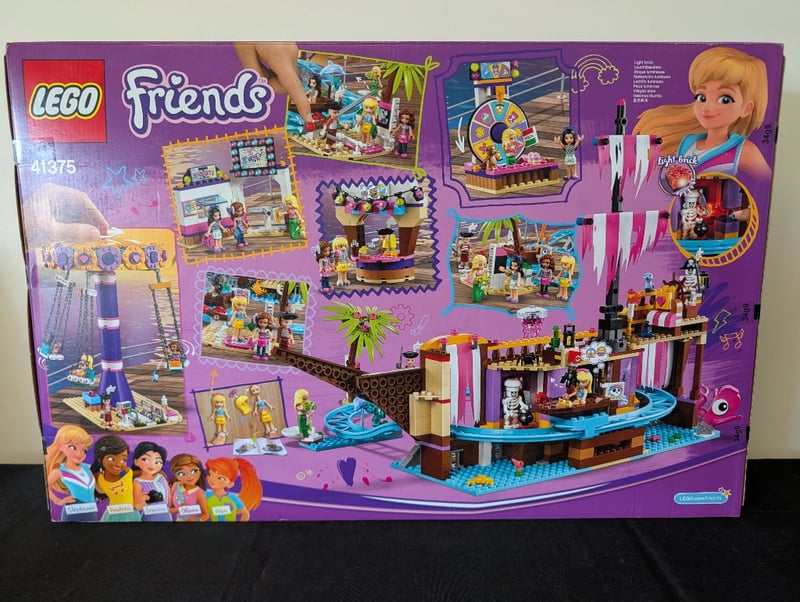 LEGO FRIENDS AMUSEMENT PARK SET 41375Item Size: Height: 60cm, Width: 35cm, Depth: 35cm, Weight: 4KgLego Friends Amusement Park Set 41375 Featuring Colorful Carnival Attractions Including A Purple And Yellow Rotating Crane Game, Ferris Wheel, Roller Coaster Track, Ice Cream Stand, And Game Booth. Includes Five Minifigures (Chloe, Zack, Aliya, Gianna, And Stephanie) With Vibrant Purple, Pink, And Tropical-Themed Decorative Elements. Complete Buildable Structures With Interactive Features On Wooden Pier-Style Base. Recommended For Ages 8+.Condition: Good - Refer To Images584531+4