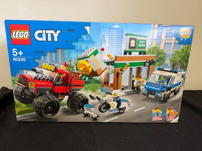 Lego City Set 60245 Featuring A Red Monster Truck With Oversized Black Wheels, Police Motorcycle, Bank Building With Robbery Scene, Armoured Vehicle, And Multiple Minifigures Including Police Officers And Robbers.