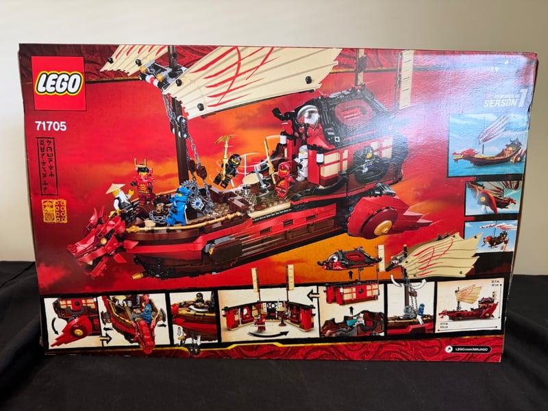Lego Ninjago Legacy Set 71705 "Destiny'S Bounty" Featuring A Large Red And Cream Sailing Vessel With Articulated Sail, Dragon Figurehead, And Multiple Minifigure Characters. Includes Detailed Deck Structures, Functional Elements, And Accessories.