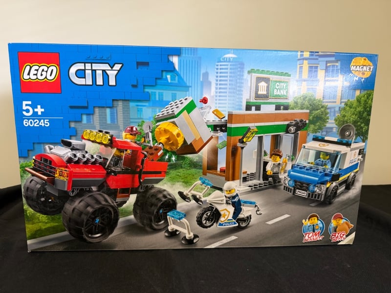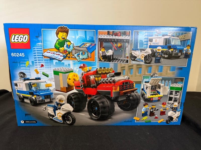 LEGO CITY SET 60245 - POLICE MONSTER TRUCK HEISTLego City Set 60245 Featuring A Red Monster Truck With Oversized Black Wheels, Police Motorcycle, Armored Bank Truck, And City Bank Building.Condition: Good - Refer To Images584532+128
