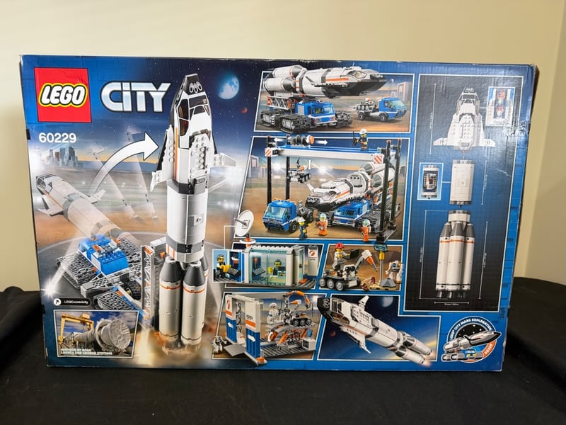 Lego City Space Launch Command Center Set 60229 Featuring A Detailed Space Shuttle With White And Orange Detailing, Mission Control Building With Satellite Dish, Launch Pad With Support Structures, Fuel Tanker Truck, Command Vehicle, And Multiple Minifigures. Includes Authentic Space Program Accessories And Operational Elements. Age Rating 7+.