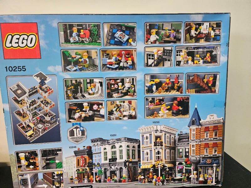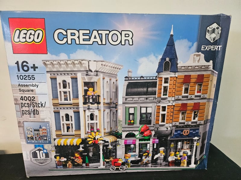 Lego Creator Expert Series Set 10255 Assembly Square Featuring 4002 Pieces. This Advanced Modular Building Set Depicts A Detailed Urban Streetscape With Multiple Interconnected Buildings Including A Classical Assembly Hall With Columned Facade, Residential Apartments With Varied Architectural Details, And Ground-Level Retail Spaces.Features Intricate Brick Work, Detailed Window Frames, Decorative Rooflines With Spires, And Street-Level Storefronts With Functional Elements. Marked As 10Th Anniver