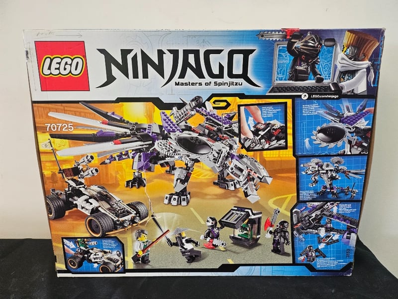 Lego Ninjago Set 70725 Featuring The Nindroid Mechdragon With Purple And Black Colour Scheme, Includes Buildable Mech Dragon With Articulated Limbs, Small Vehicle Component, And Minifigures.