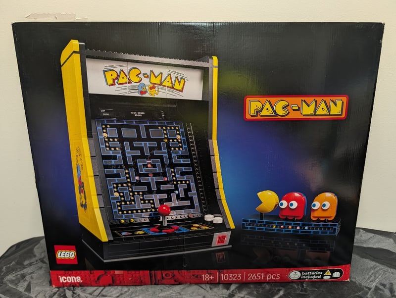 Lego Icons Pac-Man Arcade Cabinet (Set 10323) Featuring 2,651 Pieces With Functional Arcade-Style Display Screen, Yellow And Black Cabinet Construction, Buildable Pac-Man Character With Red And Orange Ghost Figures, Includes Minifigure Accessories, Battery-Operated Components, And Detailed Interior Gaming Mechanics. Age 18+.