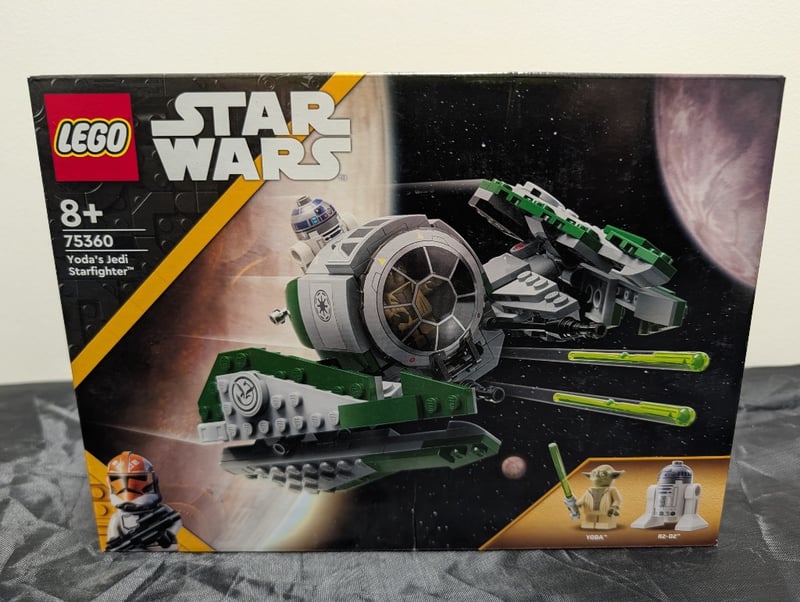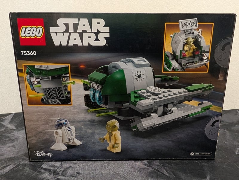 Lego Star Wars Set 75360 Featuring Yoda'S Jedi Starfighter With Green And White Colour Scheme, Includes Minifigures Of Yoda And R2-D2, Buildable Starfighter With Opening Cockpit And Detachable Wings, Age 8+, Sealed Original Packaging With Display Box Showing Spacecraft And Character Details.