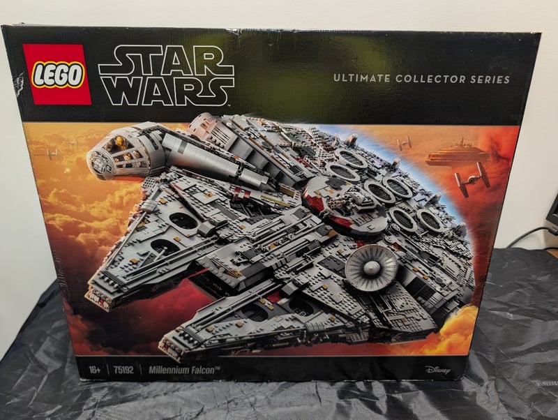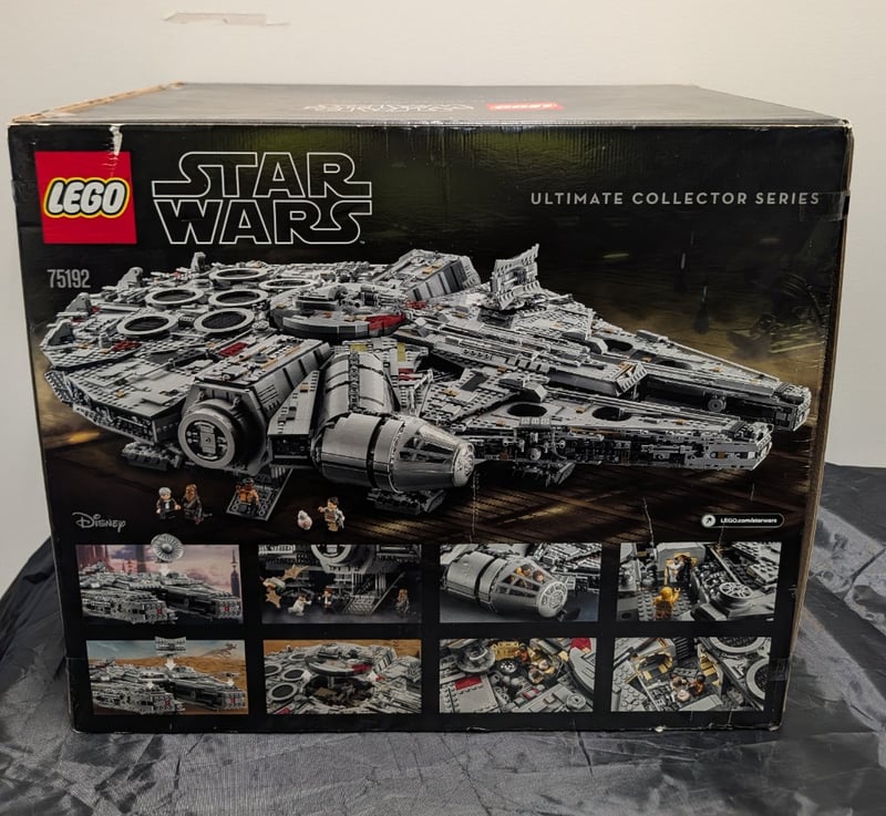 Lego Star Wars Ultimate Collector Series Millennium Falcon (Set 75192) Featuring Intricate Detailing With 7,541 Pieces, Includes Minifigures And Display Stand, Original Packaging With Minor Wear.
