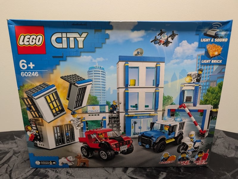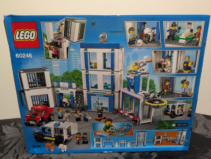 Lego City Police Station Set 60246 Featuring A Three-Story Modular Police Headquarters With Light And Sound Functionality, Including A Detachable Jail Cell Module, Two Buildable Vehicles (Red Fire Truck And Blue Police Car), Light Brick Element, And Multiple Minifigures With Accessories. Set Includes Rotating Satellite Dish, Opening Doors And Windows, And Detailed Interior Spaces For Interactive Play Scenarios.