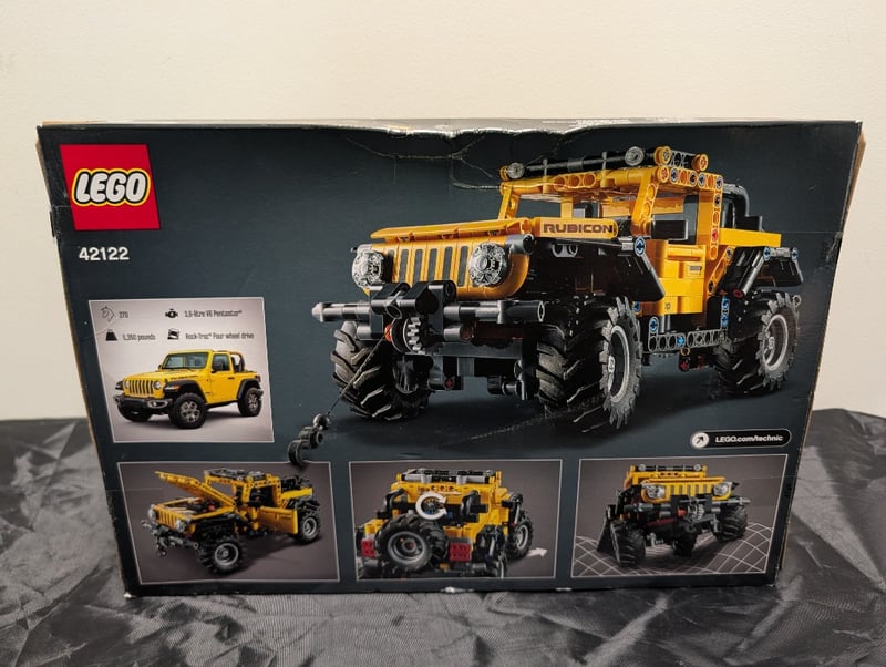Unopened Lego Technic Jeep Wrangler Rubicon Set (42122) Featuring Yellow And Black Construction With Detailed Mechanical Elements. Includes Motorized All-Terrain Vehicle With Functional Winch, Articulated Suspension, And Removable Roof Rack. Buildable Into Multiple Configurations. Age 9+. Approximately 1,330 Pieces