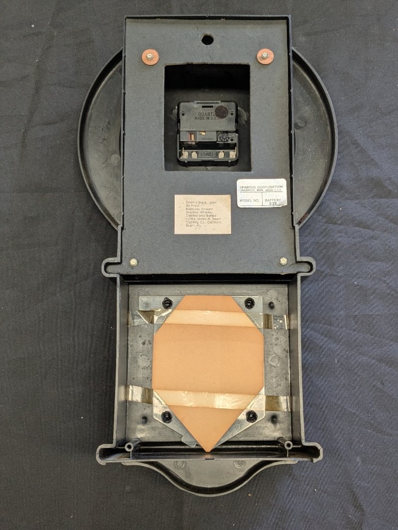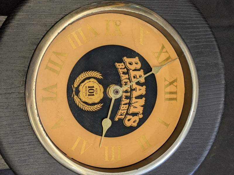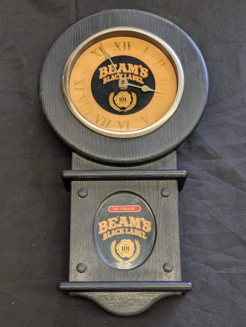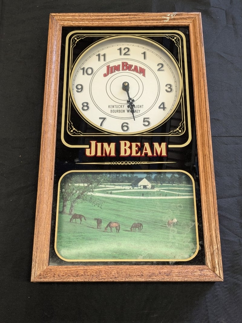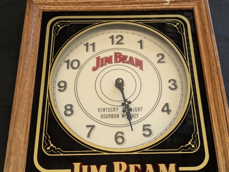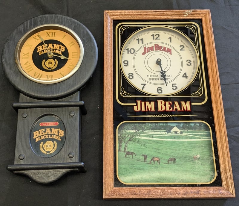 TWO JIM BEAM WALL CLOCKS Two Jim Beam Kentucky Straight Bourbon Whiskey Promotional Wall Clocks With One Featuring Iconic Distillery Imagery Clock Lengths Range From: 44Cm - 50Cm Condition: Good - Refer To Images 584534+11