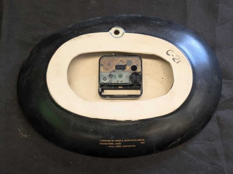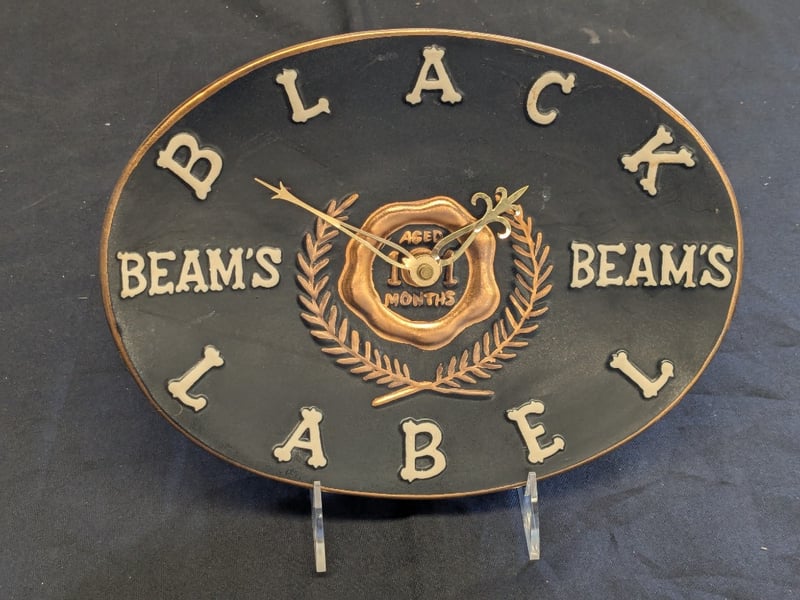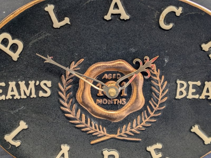 BLACK LACQUER "BLACK LABEL" BEAM'S WHISKEY ADVERTISING CLOCK Item Size: Height: 21cm, Width: 28cm, Depth: 5cm, Weight: 1Kg Oval Wall Clock Featuring Black Lacquer Face With Cream-Colored Bone Hour Markers And "Black Label Beam'S" Text. Center Medallion Reads "Aged 23 Months" With Decorative Laurel Wreath Surround. Brass-Tone Hands And Bezel Trim Condition: Good - Refer To Images 584534+12