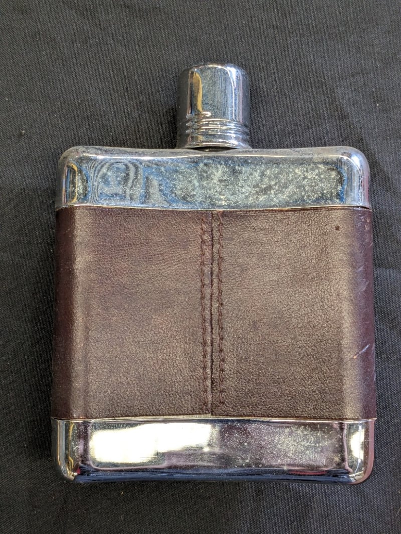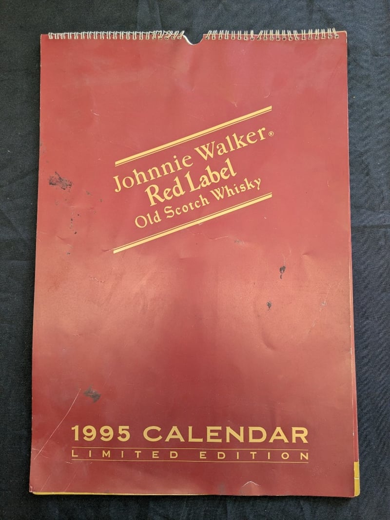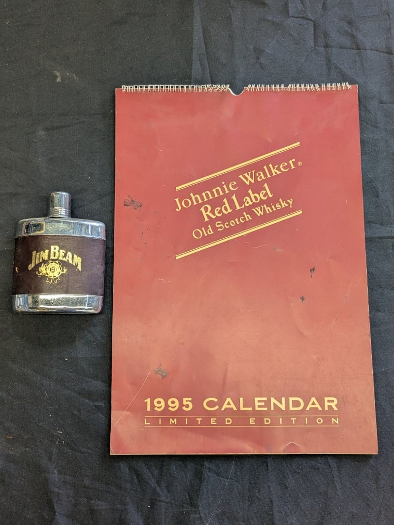 JOHNNIE WALKER RED LABEL FLASK WITH 1995 LIMITED EDITION CALENDAR Leather Style Bound Stainless Steel Hip Flask Featuring Johnnie Walker Red Label Branding With Chrome Fittings, Accompanied By A 1995 Johnnie Walker Red Label Old Scotch Whisky Limited Edition Spiral-Bound Calendar. Calendar Features Vintage Illustrations And Period Advertising Imagery. Condition: Good - Refer To Images 584534+13