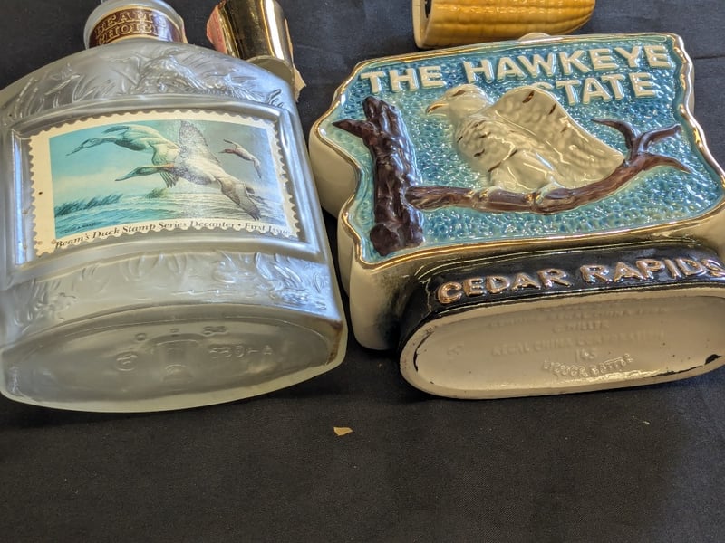 Jim Beam Bourbon Decanters Featuring The Duck Stamp Series, Including Cedar Rapids "The Hawkeye State" And 1980 "5 Seasons Club" Ceramic Corn Cob Stoppered Bottles With Embossed Waterfowl Motifs. Includes Original Glass Decanter With Flying Ducks Illustration And Brass Stopper Marked "Beam'S Choice." Collectible Whiskey Bottles From The 1970S-1980S Era With Hand-Painted Ceramic Bases And Detailed Relief Work.