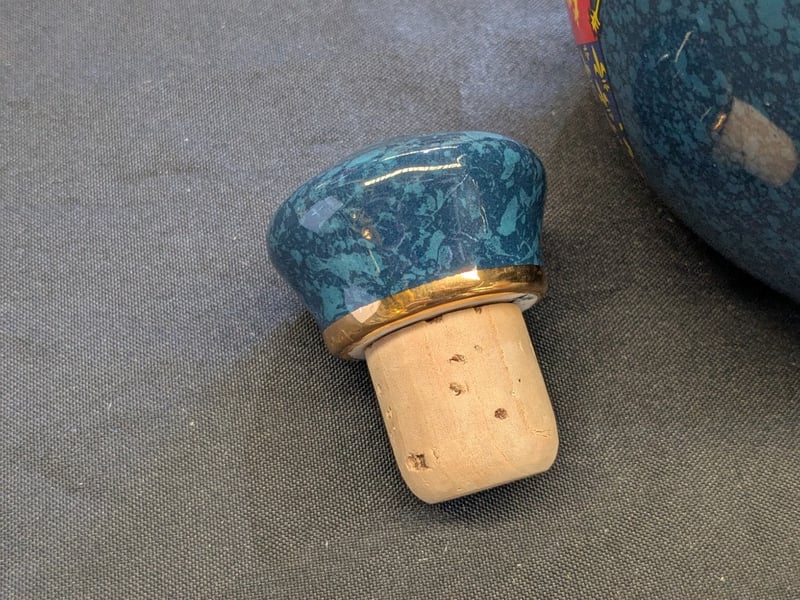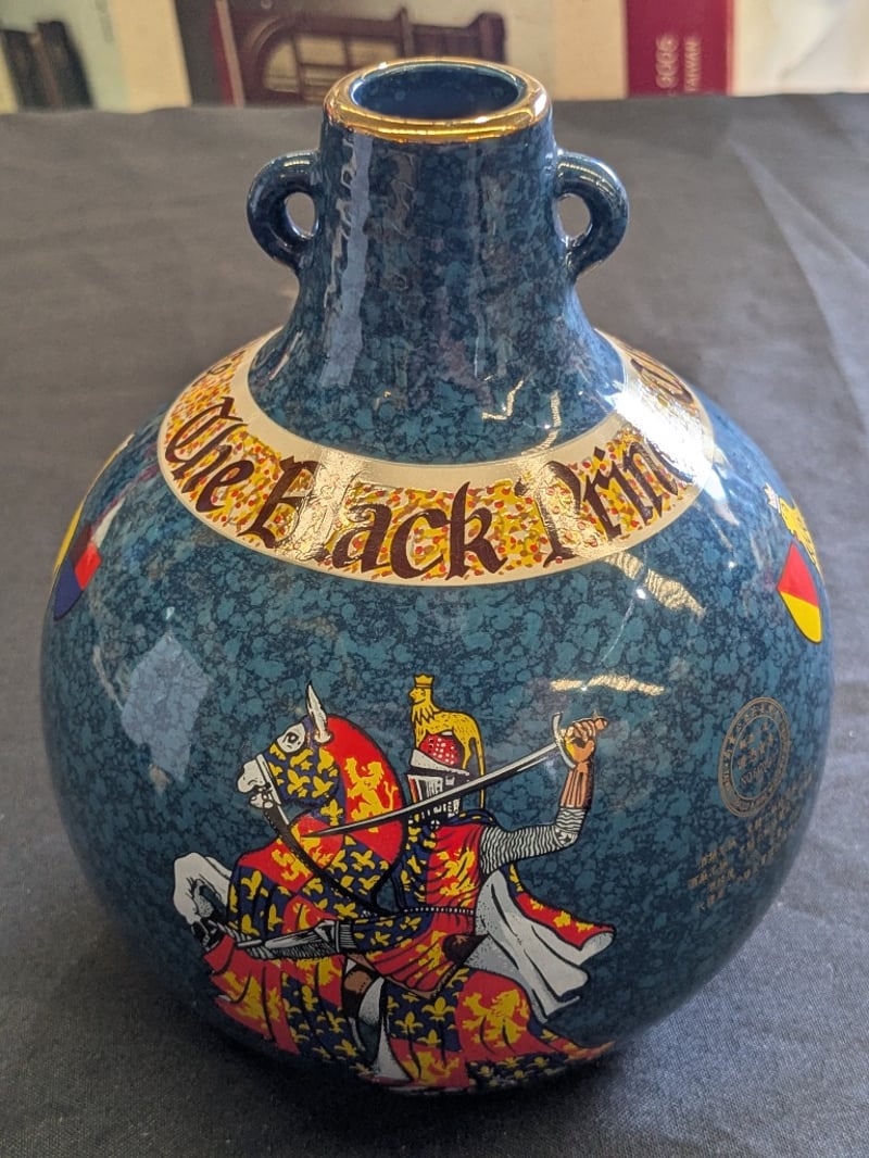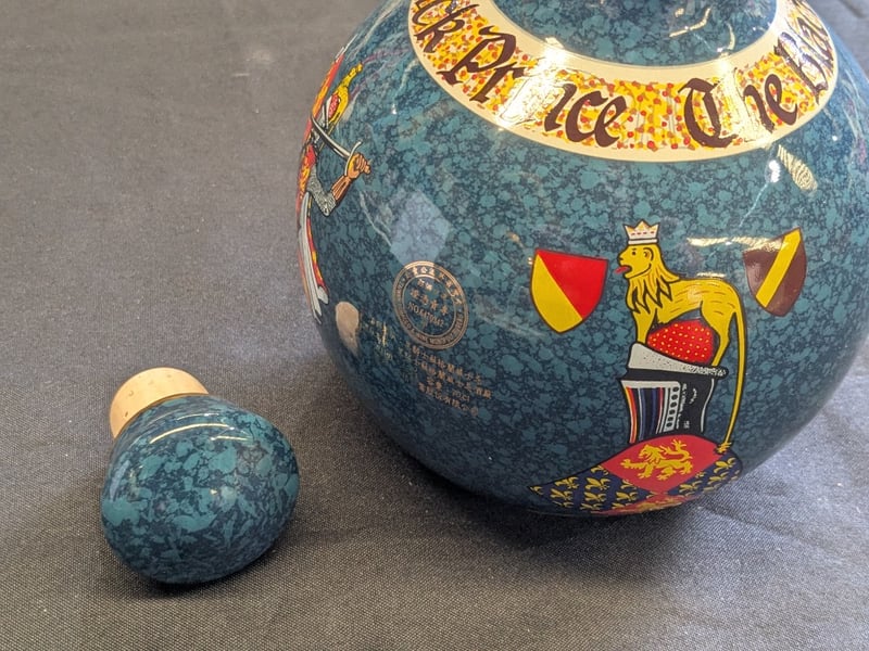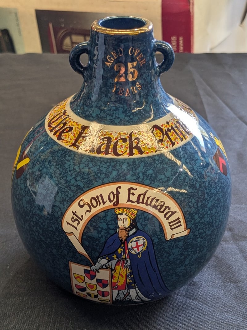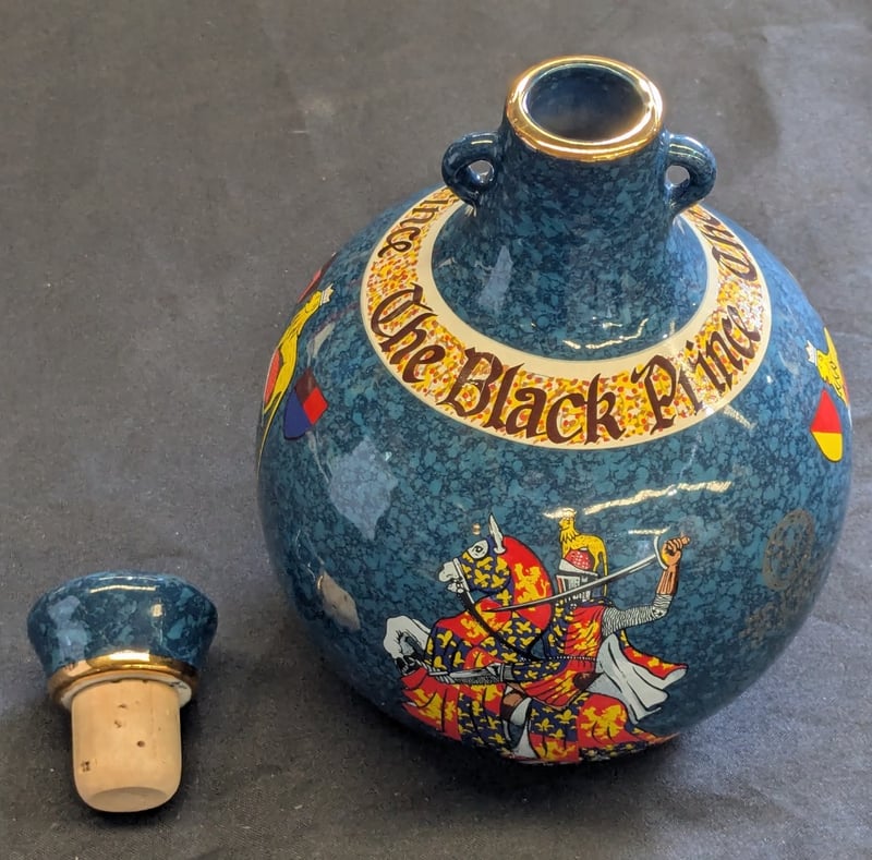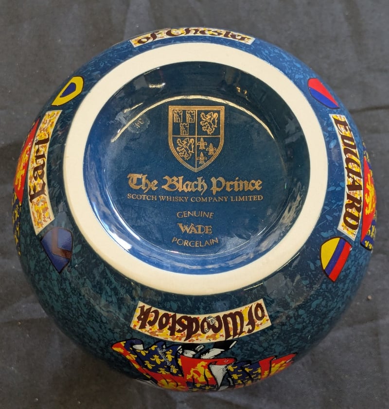 THE BLACK PRINCE SCOTCH WHISKY DECANTER - WADE PORCELAIN Item Size: Height: 18cm, Width: 14cm, Depth: 14cm Wade Porcelain Decanter Featuring Teal Crackle Glaze With Gilt Banding, Depicting Heraldic Shields And A Medieval Knight In Full Regalia. Gold-Trimmed Rim With Cork Stopper. Marked "Aged Over 25 Years" On Neck. The Black Prince Scotch Whisky Company Limited Branding Visible On Base. Condition: Good - Refer To Images 584534+36