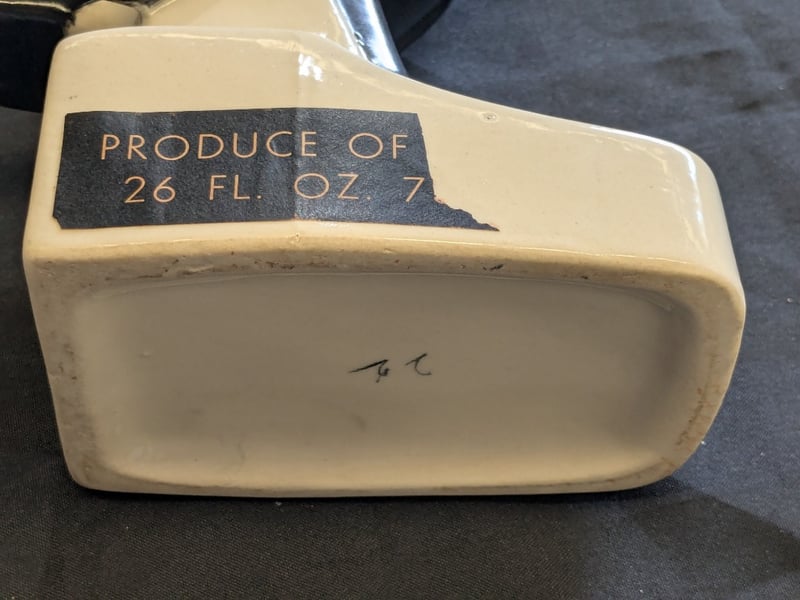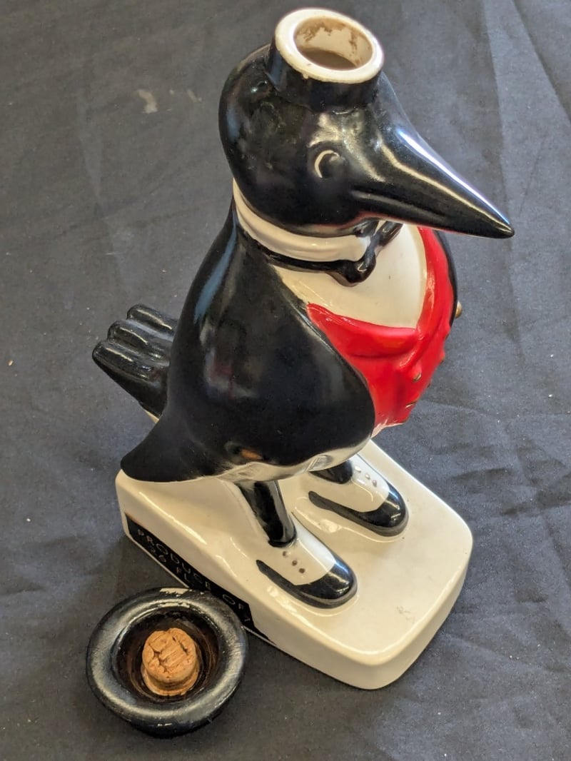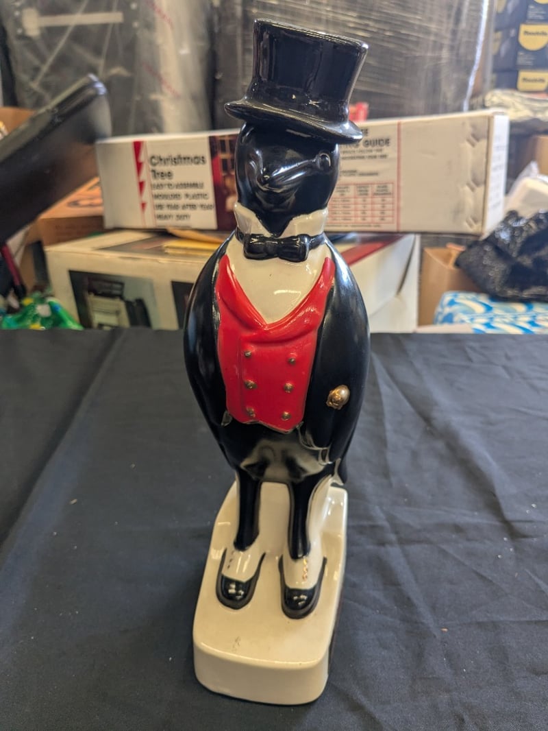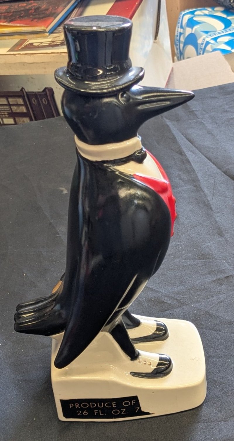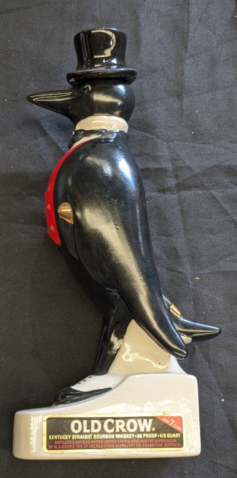 OLD CROW KENTUCKY BOURBON WHISKEY PENGUIN DECANTER Item Size: Height: 35cm, Width: 10cm, Depth: 14cm Charming Ceramic Penguin Decanter Featuring Old Crow Kentucky Straight Bourbon Whiskey Branding. Black Glazed Penguin Figure With Cream-Coloured Base, Dressed In Formal Attire With Red Waistcoat And Cream Collar. Top Hat Removable Stopper. Base Marked "Produce Of 26 Fl. Oz" Indicating Original 26 Fluid Ounce Capacity Condition: Fair - Refer To Images 584534+44