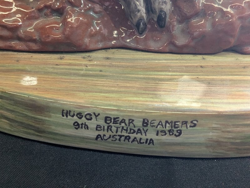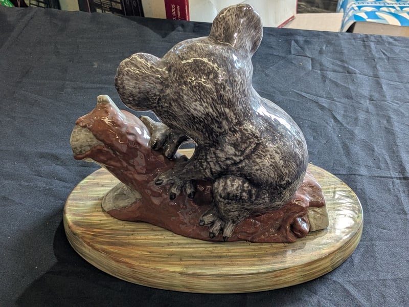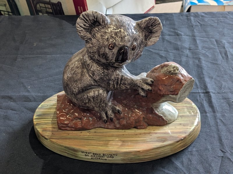 HUGGY BEAR BEAMERS 9TH BIRTHDAY COMMEMORATIVE KOALA SCULPTURE Item Size: Height: 23cm, Width: 31cm, Depth: 18cm Charming Ceramic Koala Figurine Mounted On Base, Hand-Painted With Naturalistic Grey And White Glazing, Clutching A Brown Log. Commemorates Huggy Bear Beamers 9Th Birthday, 1989, Australia. Condition: Good - Refer To Images 584534+47