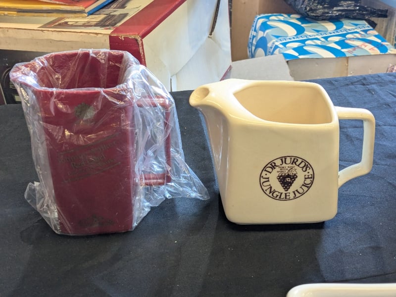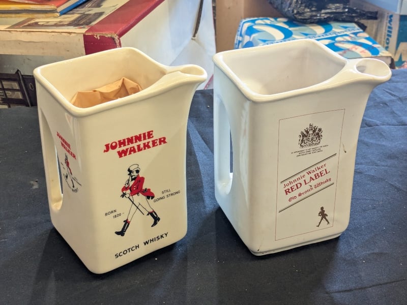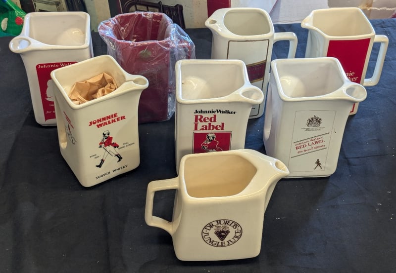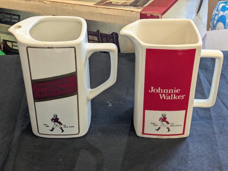 Curated Collection Of Ceramic Promotional Jugs Featuring Johnnie Walker Branding, Including Red Label And Vintage Variants. Cream-Coloured Ceramic Vessels With Applied Red And Black Printed Graphics Depicting The Iconic Johnnie Walker Striding Figure. Includes Multiple Pitcher Styles With Pouring Spouts And Handle Details. Represents Classic Mid-20Th Century Whisky Brand Merchandise And Collectible Barware.