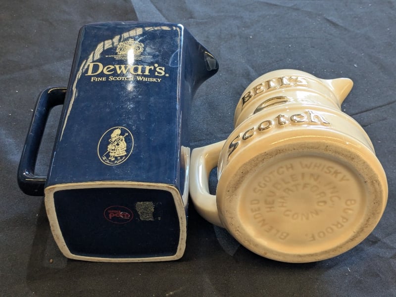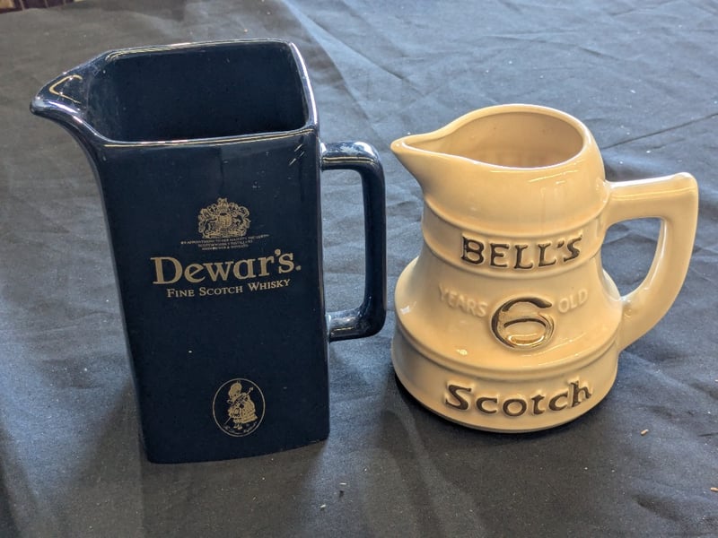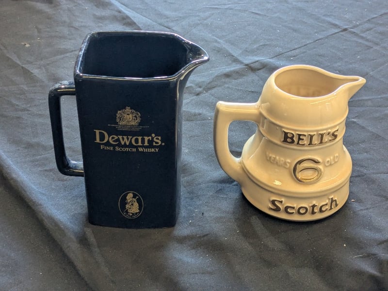 Two Ceramic Whisky Jugs Featuring Iconic Scottish Distillery Branding. The Dewar'S Fine Scotch Whisky Jug Is Rendered In Deep Navy Blue Glaze With Gilt Heraldic Crest And Lettering. The Bell'S Scotch Jug Features Cream-Coloured Ceramic With Embossed Branding And Decorative Ring Motif. Both Pieces Display Characteristic Pouring Spouts And Robust Handles Typical Of Mid-20Th Century Promotional Barware.