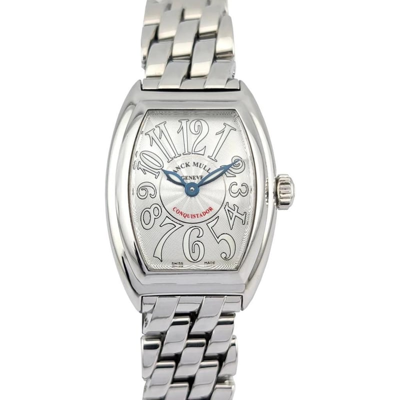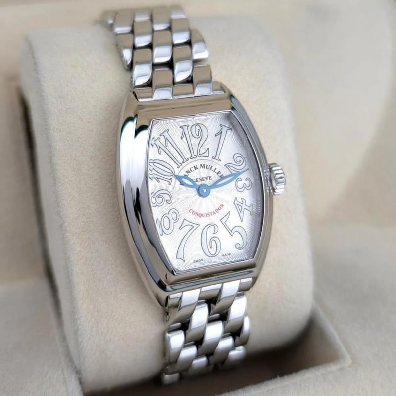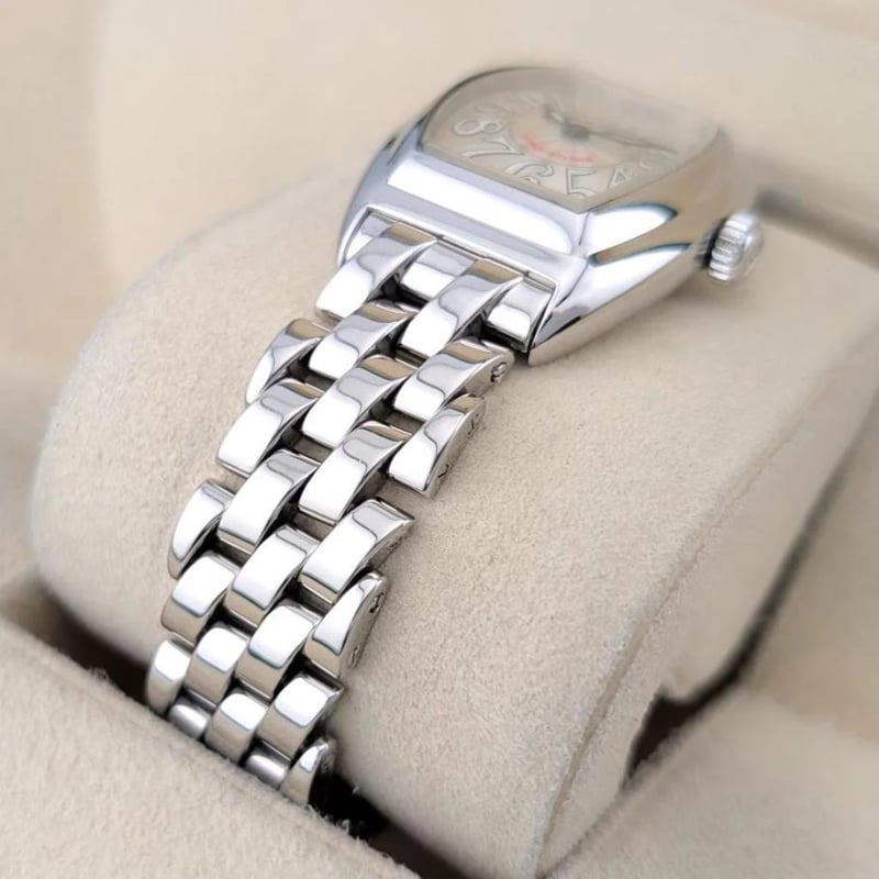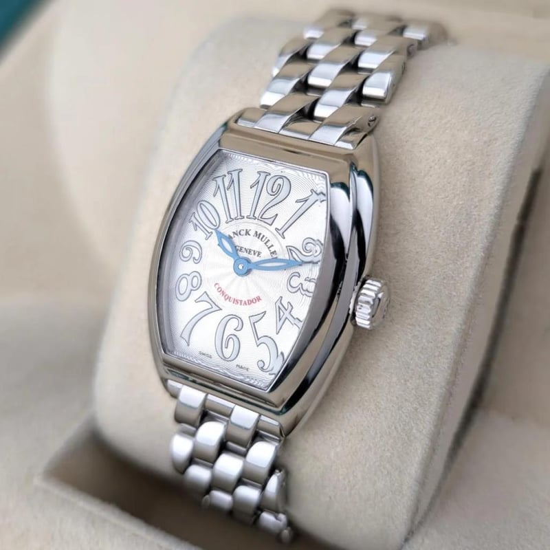 FRANCK MULLER 8005LQZ CONQUISTADOR SILVER 28MM ~2000S BOX & PAPERS Brand: Franck Muller Model Number: Conquistador Silver Reference Number: 8005L QZ Production Year: 2000s Case Size: 28mm x 39mm Movement: Quartz Box: Not Included