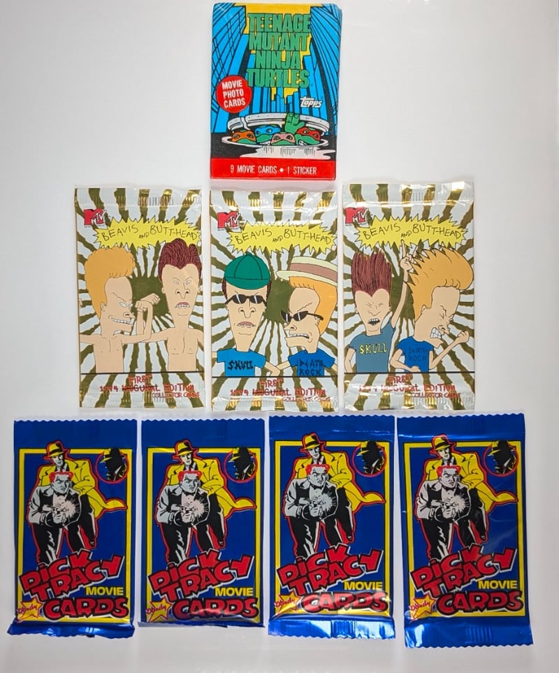 COLLECTION OF SEVERAL UNOPENED PACKS OF VINTAGE TRADING CARDS, QTY 8 PACKS.Item Size: Height: 56cm, Width: 5cm, Depth: 5cm, Weight: 0.5KgCollection Includes 4 Packs Of Dick Tracy Movie Cards From 1990, 1 Pack Topps Teenage Mutant Ninja Turtles Movie Photo Cards Containing 9 Cards And 1 Sticker, 3 Packs Of 1994 Mtv Beavis And Butt-Head Collector Cards. Total Qty 7 Packs.Condition: Good - Refer To ImagesFC163119+5