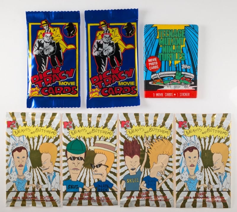 Collection Includes 2 Packs Of Dick Tracy Movie Cards From 1990, 1 Pack Topps Teenage Mutant Ninja Turtles Movie Photo Cards Containing 9 Cards And 1 Sticker, 4 Packs Of 1994 Mtv Beavis And Butt-Head Collector Cards. Total Qty 7 Packs.