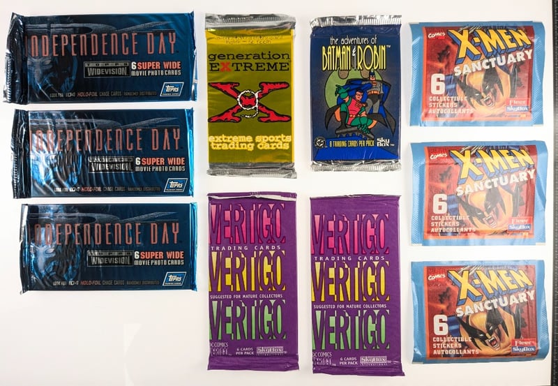 COLLECTION OF VINTAGE TRADING CARD PACKS FROM THE 1990S, QTY 10 PACKSItem Size: Height: 5cm, Width: 5cm, Depth: 5cm, Weight: 0.5Kg3 Packs Of 1996 Independence Day Widevision Cards From Topps, 1 Pack Of 1994 Generation Extreme Extreme Sports Trading Cards, 1 Pack Of 1995 The Adventures Of Batman & Robin Cards From Skybox, 2 Packs Of 1993 Dc Comics Vertigo Trading Cards Fro, 3 Packs Of 1994 X-Men Sanctuary Collectible Stickers From Fleer Skybox.M SkyboxCondition: Good - Refer To ImagesFC163119+13