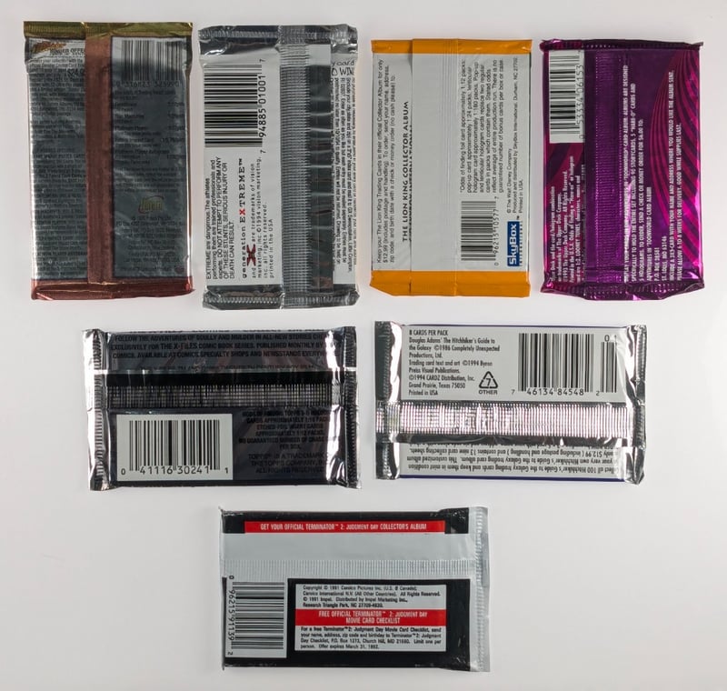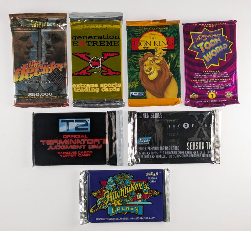 COLLECTION OF VINTAGE UNOPENED TRADING CARD PACKS FROM THE 1990S, INCLUDING POPULAR SPORTS, MOVIE, AND CARTOON FRANCHISES, QTY 7.Item Size: Height: 5cm, Width: 5cm, Depth: 5cm, Weight: 0.5Kg1993 Upper Deck Adventures In Toon World, Terminator 2: Judgment Day, Disney'S The Lion King, The X-Files, The Hitchhiker'S Guide To The Galaxy, Generation ExtremeCondition: Good - Refer To ImagesFC163119+14