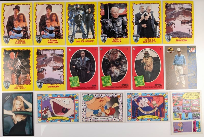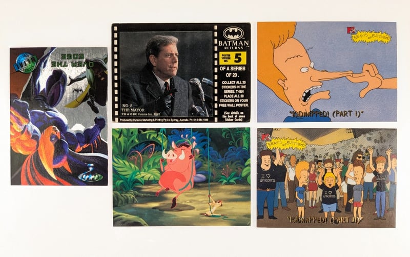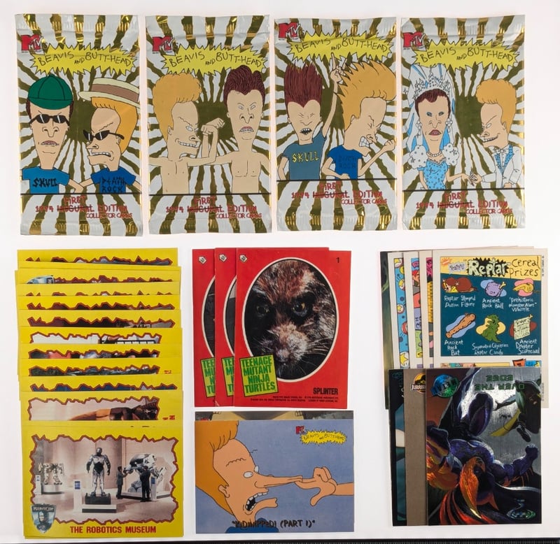 COLLECTION OF TRADING CARDS, STICKER SHEETS, AND POTENTIAL PROMO CARDS FROM OTHER 90S FRANCHISESItem Size: Height: 5cm, Width: 5cm, Depth: 5cm, Weight: 0.5Kg1994 Fleer Ultra Beavis And Butt-Head Trading Card 4 Packs, 1990 Topps Robocop 2 Trading Cards, 1992 Sticker Card Batman Returns, Beavis And Butt-Head: Trading Cards From The 1995 Fleer Ultra Mtv Animation Series, 1992 Batman Returns "The Mayor" Poster Sticker, 1990 Topps Robocop 2 Movie Trading Cards, 1990 Topps Teenage Mutant Ninja Turtles Movie Trading Cards, 1993 Topps Nickelodeon Nicktoons Trading Cards,Condition: Good - Refer To ImagesFC163119+19