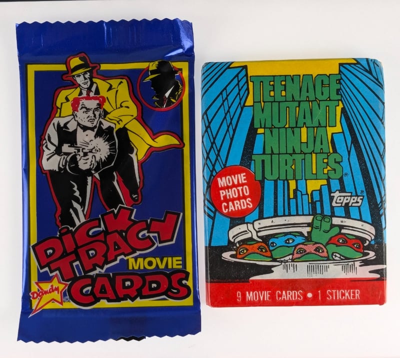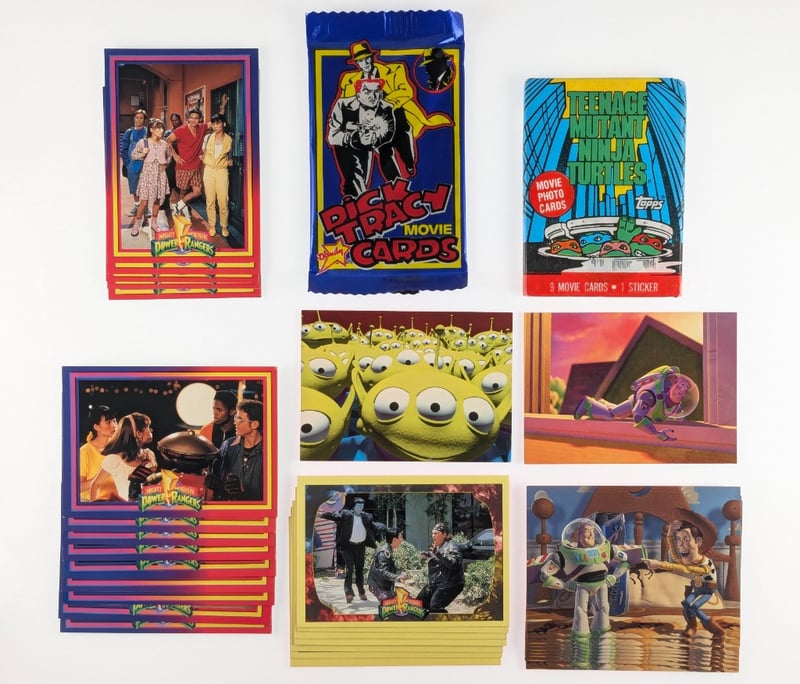 1990 VINTAGE MOVIE TRADING CARDS AND STICKERS FRIM VARIOUS FRANCHISES.Item Size: Height: 5cm, Width: 5cm, Depth: 5cm, Weight: 0.5Kg1994 Mighty Morphin Power Rangers "Series 1" Set, 1990 Topps Dick Tracy Movie Trading Cards, 1990 Topps Teenage Mutant Ninja Turtles Movie Trading Card Pack, 1995 Skybox Toy Story Trading Cards.Condition: Good - Refer To ImagesFC163119+20