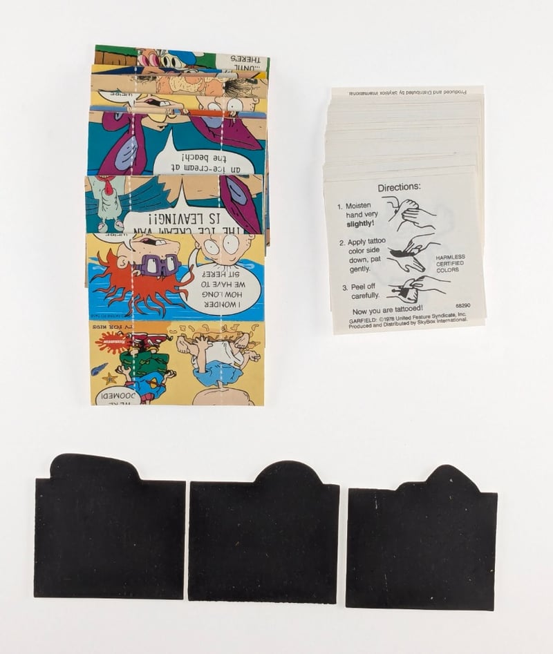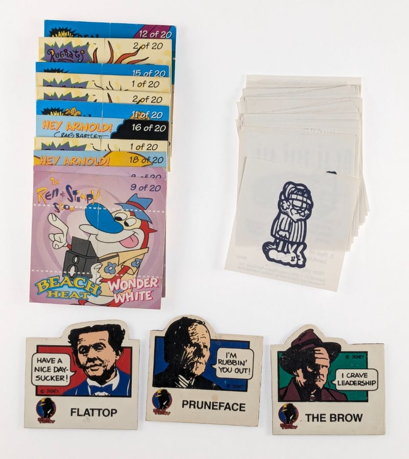 COLLECTION OF VINTAGE COLLECTIBLES, INCLUDING CARDS AND STICKERS FROM POPULAR 1990S TELEVISION SHOWS AND MOVIES.Item Size: Height: 5cm, Width: 5cm, Depth: 5cm, Weight: 0.5Kg1990S Cartoons: Features Trading Cards From Nicktoon Classics Like Rugrats And Hey Arnold!, Dick Tracy Stickers: Includes Character Stickers Of Flattop, Pruneface, And The Brow From The 1990 Dick Tracy Movie, Ren & Stimpy: Features A Large Sticker Or Card From The Ren & Stimpy Show.Condition: Good - Refer To ImagesFC163119+23