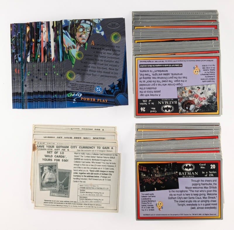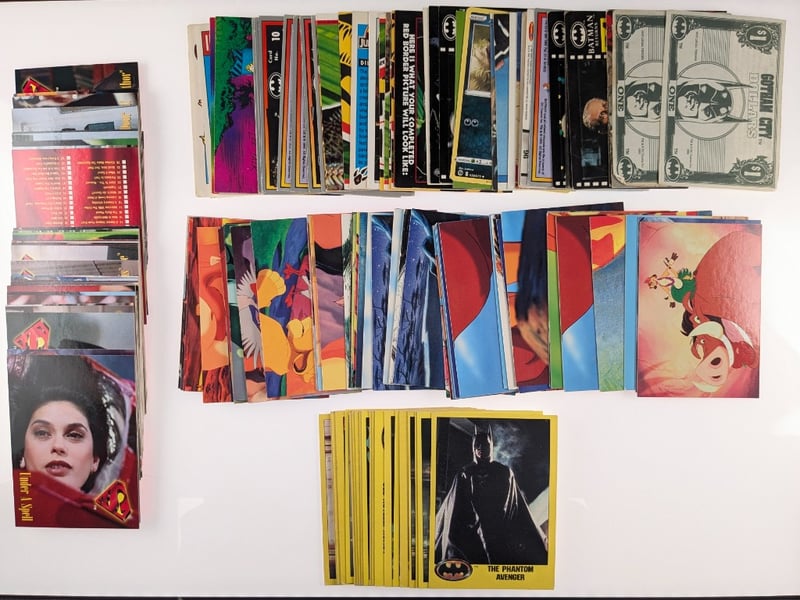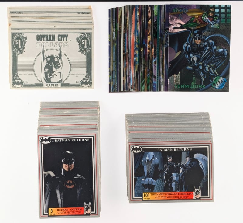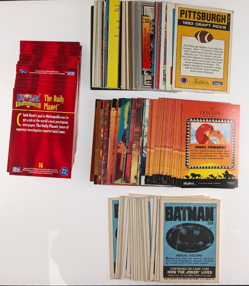 COLLECTION OF VINTAGE NON-SPORT TRADING CARDS, FEATURING COLLECTIONS FROM THE 1989 TOPPS BATMAN MOVIE SET AND OTHER DISNEY-THEMED SERIES.Item Size: Height: 5cm, Width: 5cm, Depth: 5cm, Weight: 0.5KgBatman Cards: Includes "The Phantom Avenger" Card And Novelty "Gotham City Dollars". Other Cards: Features Various Movie Scenes And Characters, Including Disney Films Like The Lion King And The Pagemaster.Condition: Good - Refer To ImagesFC163119+31