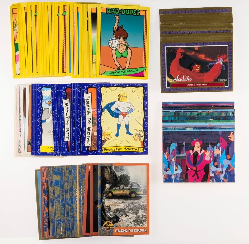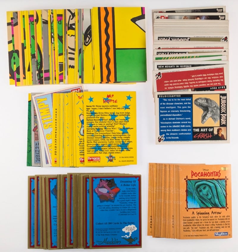 COLLECTION OF 1990S TRADING CARDS FEATURING VARIOUS POP CULTURE FRANCHISESItem Size: Height: 5cm, Width: 5cm, Depth: 5cm, Weight: 0.5KgCollection Includes Jurassic Park: Trading Cards From The Original Topps Series, Including "Stalking The Explorer", Disney'S Aladdin: Cards Depicting Jafar And Other Scenes From The Animated Film, Ren & Stimpy: Cards Featuring Characters Like Powdered Toastman, Rad Dudes: A Trading Card Featuring "Awesome Volleyball Val."Condition: Good - Refer To ImagesFC163119+35